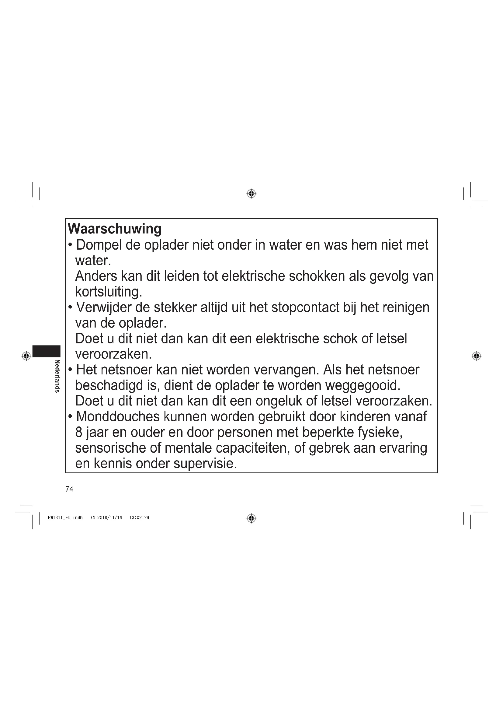 Het nominale vermogen overschrijden door teveel stekkers op één stopcontact aan te sluiten, kan door overhitting tot brand leiden. EW1311_EU.indb 76 2018/11/14 13:02:2977 Nederlands WAARSCHUWING Zorg ervoor dat het apparaat altijd is aangesloten op een stopcontact met dezelfde spanningswaarden alsdewaardendieopdeopladervermeldstaan. Steekdestekkervolledigin.