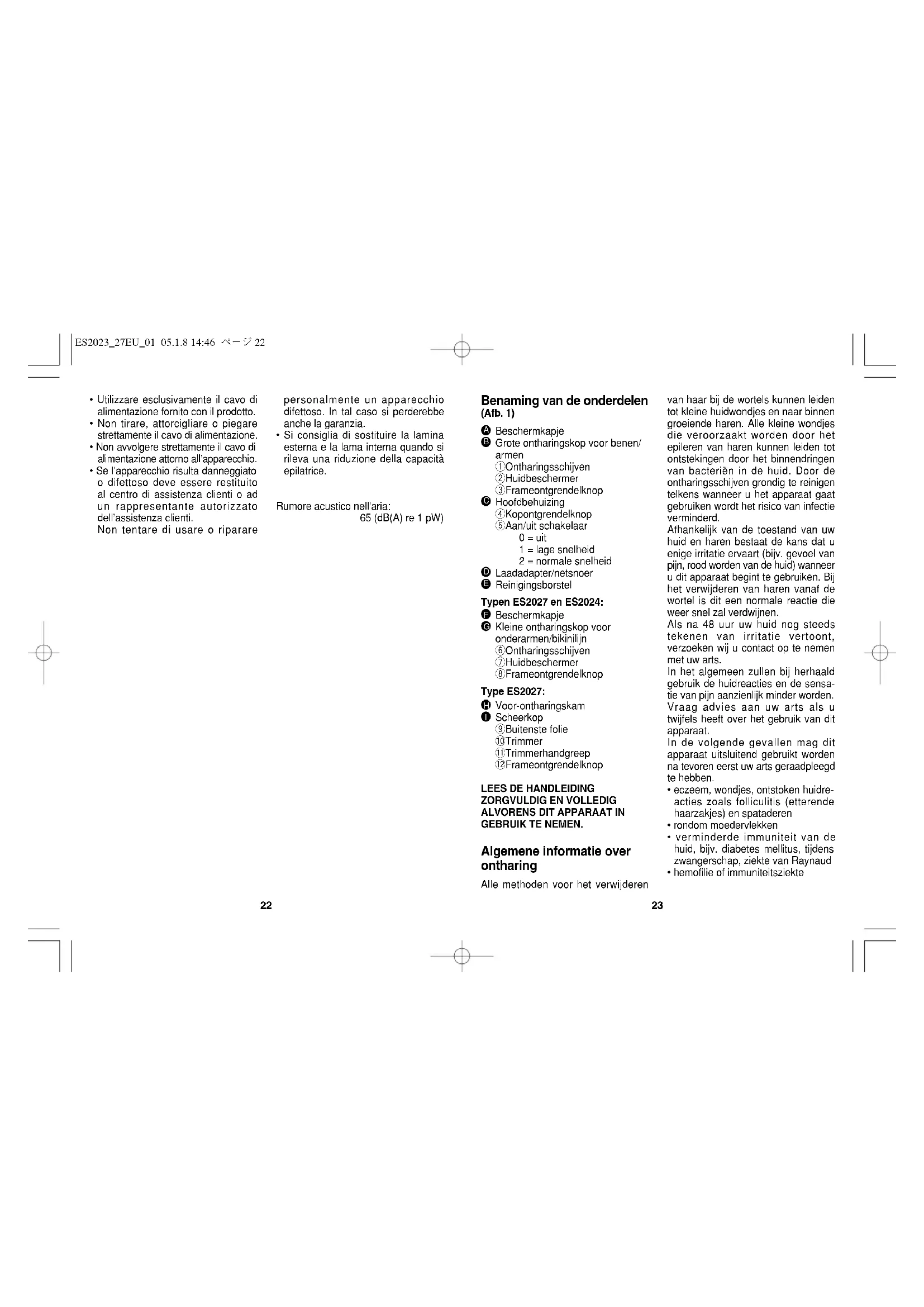 - Si consiglia di sostituire la lamina esterna e la lama interna quando si rileva una riduzione della capacità epilatrice. Rumore acustico nell'aria: 65 (dB(A) re 1 pW) ES202327EU0105.1.814:46ページ2225 pijn. Het gevoel van pijn echter zal na herhaald gebruik verminderen. Voor deze specifieke toepassing zouden wij u graag het volgende advies willen geven: