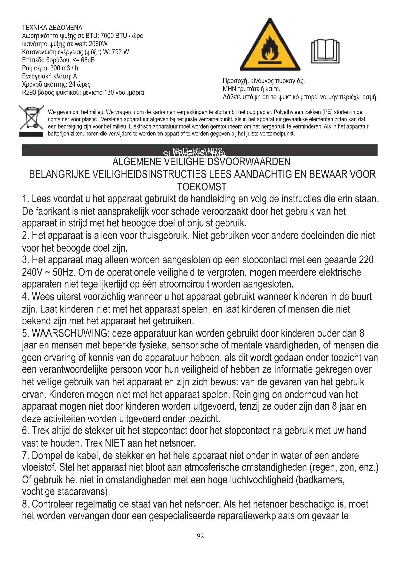 jaar en mensen met beperkte fysieke, sensorische of mentale vaardigheden, of mensen die geen ervaring of kennis van de apparatuur hebben, als dit wordt gedaan onder toezicht van een verantwoordelijke persoon voor hun veiligheid of hebben ze informatie gekregen over het veilige gebruik van het apparaat en zijn zich bewust van de gevaren van het gebruik ervan. Kinderen mogen niet met het apparaat spelen. Reiniging en onderhoud van het apparaat mogen niet door kinderen worden uitgevoerd, tenzij ze ouder zijn dan 8 jaar en deze activiteiten worden uitgevoerd onder toezicht.