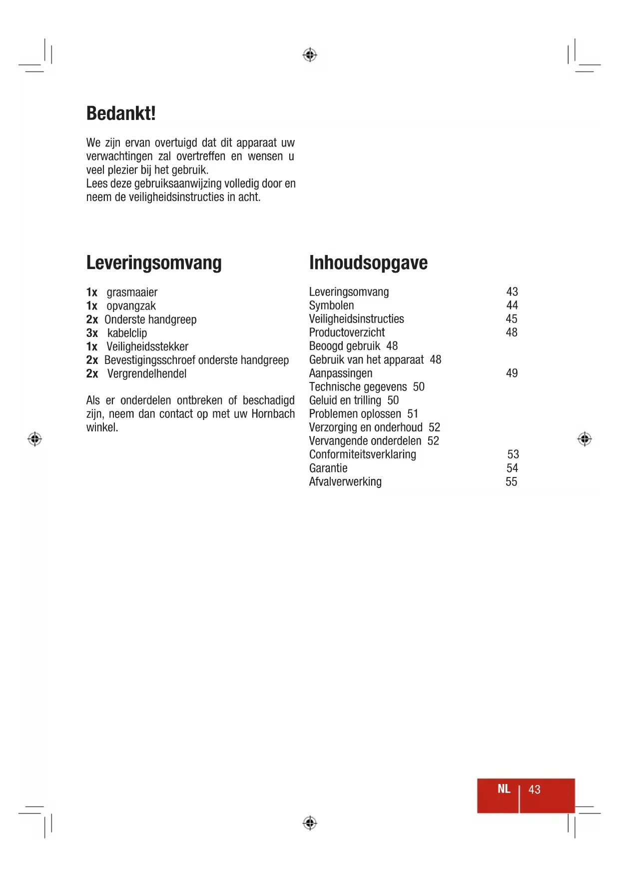 Als er onderdelen ontbreken of beschadigd zijn, neem dan contact op met uw Hornbach winkel.