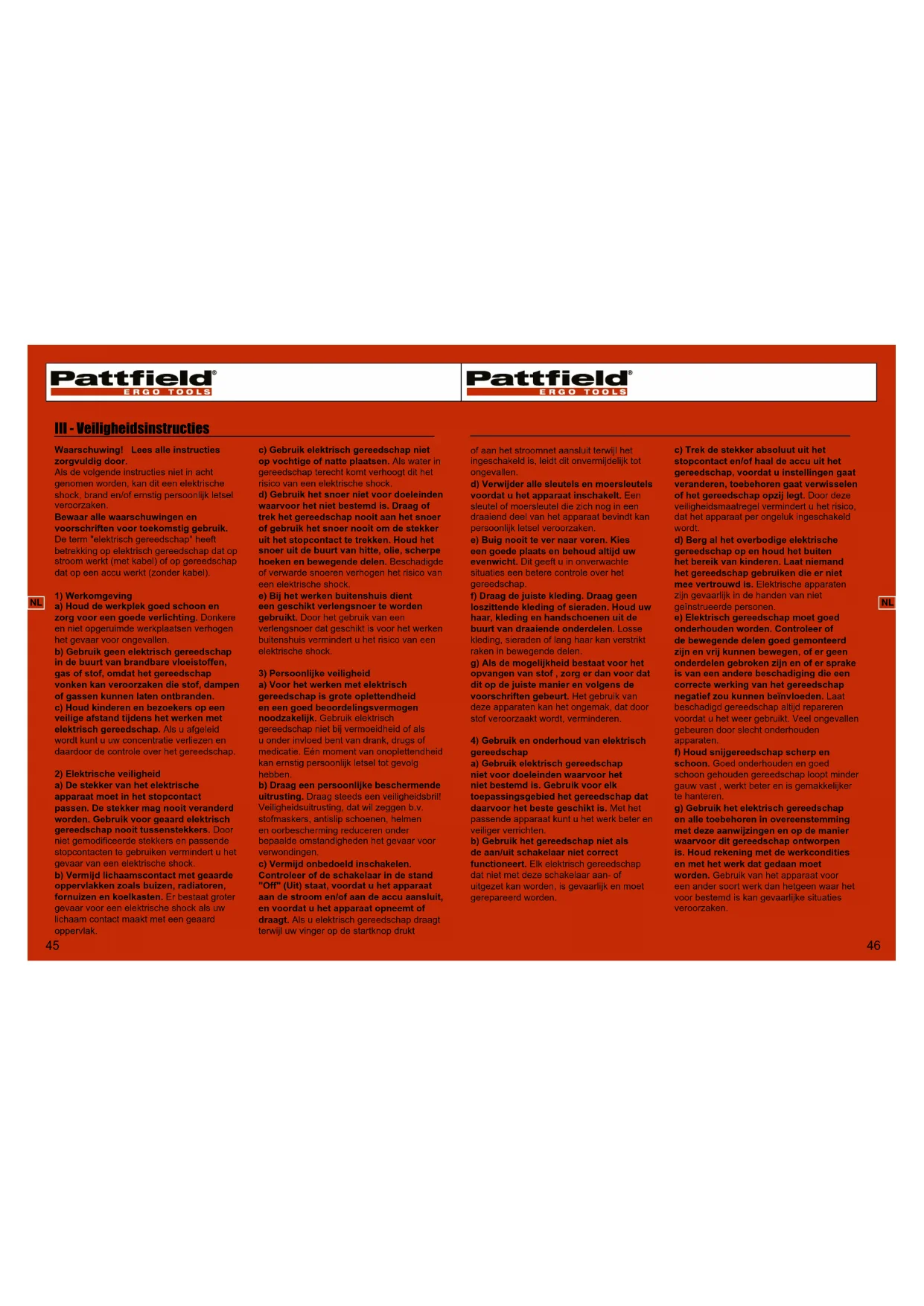 Dank u wel dat u gekozen hebts voor een machine van ons merk Pattfield. We ijern ervan overtuigd dat deze machine uw verwachtingen inzake topkwaltiteit en betrouwbaarheid za overtreffen. Gelinge de tijd te nemen om deze handleiding door te lezen voordat u de machine in gebruik neemt. Gelinge rekening te honden met de basisinstrumenties voor het gebruik en met de veiligheidsreglementeringen.