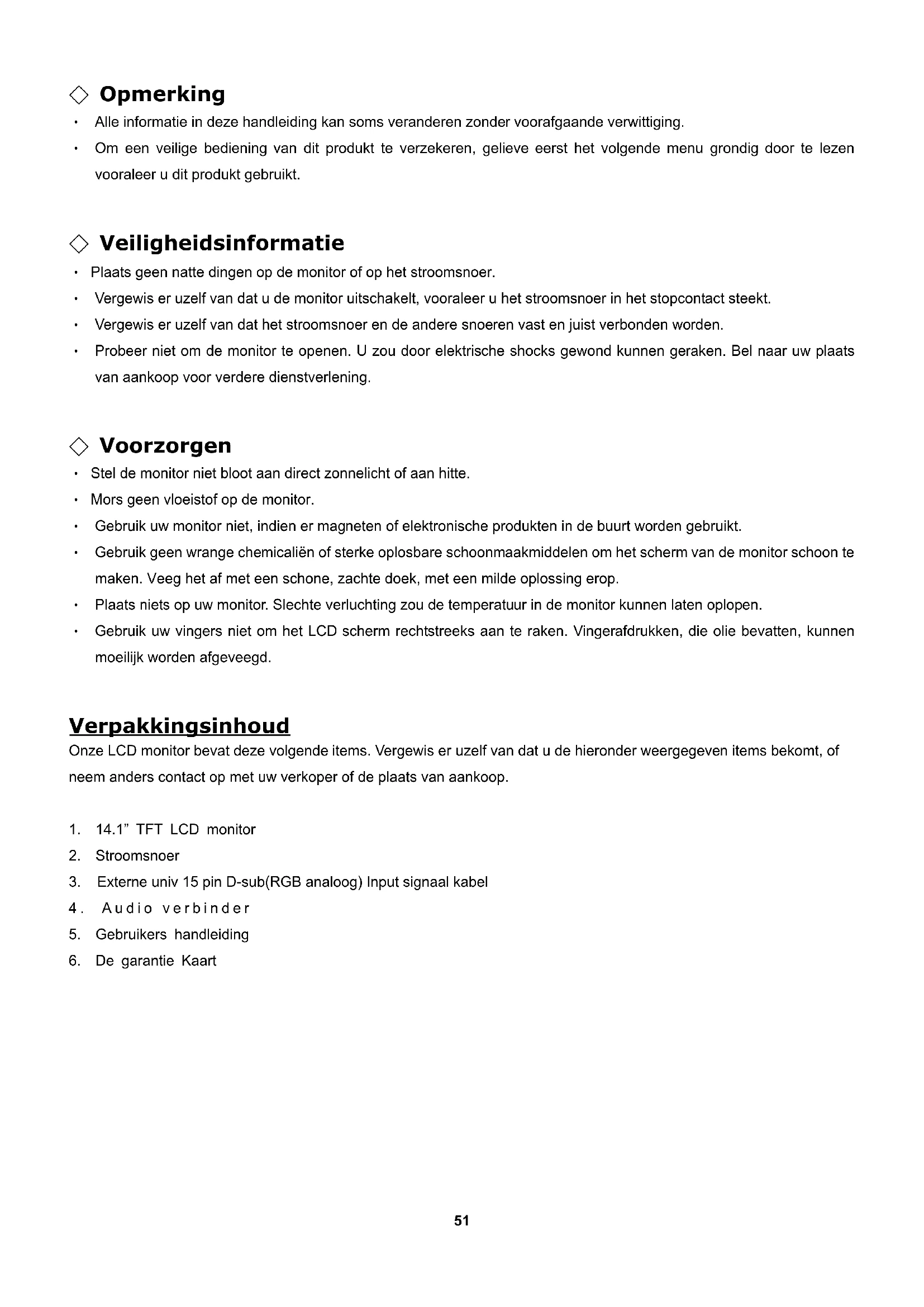 ◇ Veiligheidsinformatie ‧ Plaats geen natte dingen op de monitor of op het stroomsnoer. ‧ Vergewis er uzelf van dat u de monitor uitschakelt, vooraleer u het stroomsnoer in het stopcontact steekt. ‧ Vergewis er uzelf van dat het stroomsnoer en de andere snoeren vast en juist verbonden worden. ‧ Probeer niet om de monitor te openen. U zou door elektrische shocks gewond kunnen geraken. Bel naar uw plaats van aankoop voor verdere dienstverlening.
