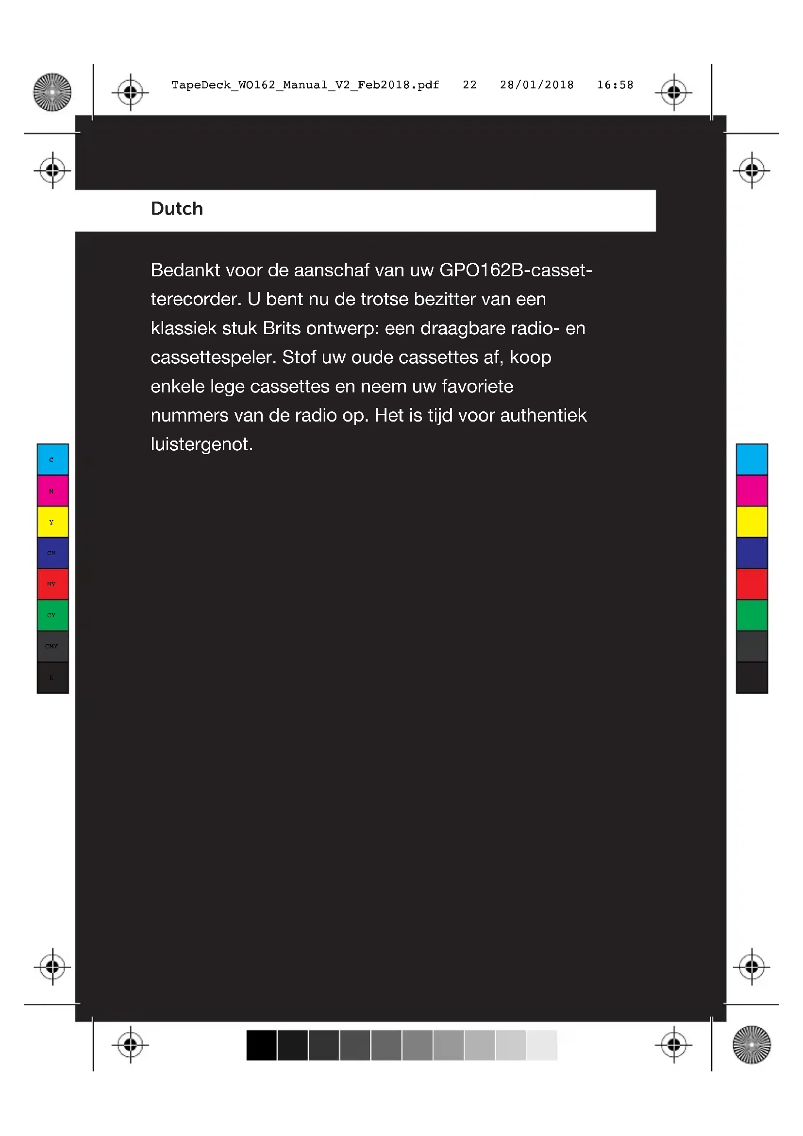 TapeDeck_WO162_Manual_V2_Feb2018.pdf 21 28/01/2018 16:58Dutch Bedankt voor de aanschaf van uw GPO162B-casset- terecorder. U bent nu de trotse bezitter van een klassiek stuk Brits ontwerp: een draagbare radio- en cassettespeler. Stof uw oude cassettes af, koop enkele lege cassettes en neem uw favoriete nummers van de radio op. Het is tijd voor authentiek luistergenot.