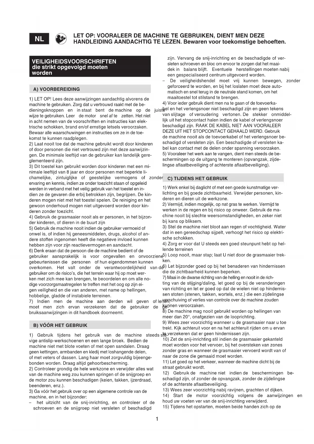 Во случај на какво било двоумење или проблем, контактирајте со Овластениот сервис во непосредна близина или со Застапникот.1 VEILIGHEIDSVOORSCHRIFTEN die strikt opgevolgd moeten worden A) VOORBEREIDING 1) LET OP! Lees deze aanwijzingen aandachtig alvorens de machine te gebruiken. Zorg dat u vertrouwd raakt met de be- dieningsknoppen en in staat bent de machine op de juiste wijze te gebruiken. Leer de motor snel af te zetten. Het niet in acht nemen van de voorschriften en instructies kan elek- trische schokken, brand en/of ernstige letsels veroorzaken. Bewaar alle waarschuwingen en instructies om ze in de toe- komst te kunnen raadplegen. 2) Laat nooit toe dat de machine gebruikt wordt door kinderen of door personen die niet vertrouwd zijn met deze aanwijzin- gen. De minimale leeftijd van de gebruiker kan landelijk gere- glementeerd zijn. 3) Dit toestel kan gebruikt worden door kinderen met een mi- nimale leeftijd van 8 jaar en door personen met beperkte li- chamelijke, zintuiglijke of geestelijke vermogens of zonder ervaring en kennis, indien ze onder toezicht staan of opgeleid werden in verband met het veilig gebruik van het toestel en in- dien ze de gevaren die erbij betrokken zijn, begrijpen. De kin- deren mogen niet met het toestel spelen. De reiniging en het gewoon onderhoud mogen niet uitgevoerd worden door kin- deren zonder toezicht. 4) Gebruik de grasmaaier nooit als er personen, in het bijzon- der kinderen, of dieren in de buurt zijn 5) Gebruik de machine nooit indien de gebruiker vermoeid of onwel is, of indien hij geneesmiddelen, drugs, alcohol of an- dere stoen ingenomen heeft die negatieve invloed kunnen hebben zijn voor zijn reactievermogen en aandacht. 6) Denk eraan dat de persoon die de machine bedient of de gebruiker aansprakelijk is voor ongevallen en onvoorziene gebeurtenissen die personen of hun eigendommen kunnen overkomen. Het valt onder de verantwoordelijkheid van de gebruiker om de risico’s, die het terrein waar hij op moet wer- ken met zich mee kan brengen, te beoordelen en om alle no- dige voorzorgsmaatregelen te treen met het oog op zijn ei- gen veiligheid en die van anderen, met name op hellingen, hobbelige, gladde of instabiele terreinen. 7) Indien men de machine aan derden wil geven of lenen, moet men zich ervan verzekeren dat de gebruiker de ge- bruiksaanwijzingen in dit handboek doorneemt.