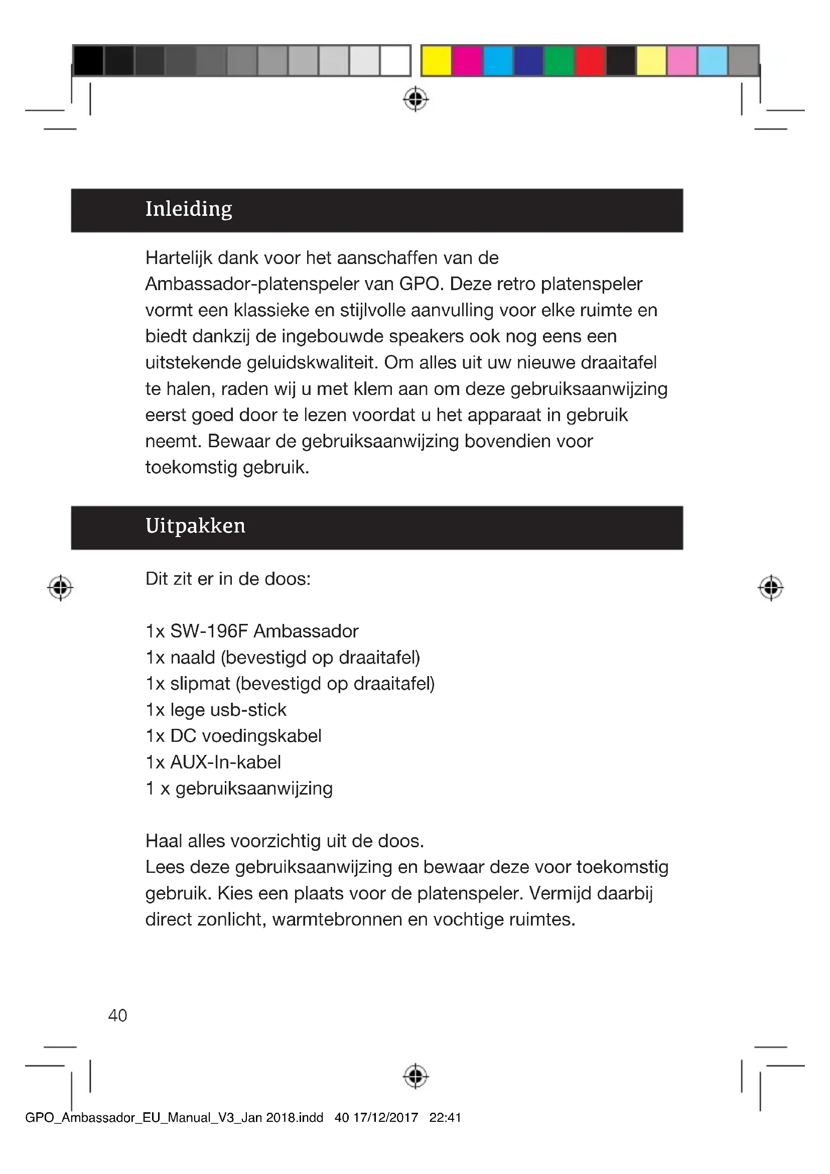 GPO_Ambassador_EU_Manual_V3_Jan 2018.indd 39 17/12/2017 22:4140 Inleiding Hartelijk dank voor het aanschaffen van de Ambassador-platenspeler van GPO. Deze retro platenspeler vormt een klassieke en stijlvolle aanvulling voor elke ruimte en biedt dankzij de ingebouwde speakers ook nog eens een uitstekende geluidskwaliteit. Om alles uit uw nieuwe draaitafel te halen, raden wij u met klem aan om deze gebruiksaanwijzing eerst goed door te lezen voordat u het apparaat in gebruik neemt. Bewaar de gebruiksaanwijzing bovendien voor toekomstig gebruik. Dit zit er in de doos: 1x SW-196F Ambassador 1x naald (bevestigd op draaitafel) 1x slipmat (bevestigd op draaitafel) 1x lege usb-stick 1x DC voedingskabel 1x AUX-In-kabel 1 x gebruiksaanwijzing Haal alles voorzichtig uit de doos. Lees deze gebruiksaanwijzing en bewaar deze voor toekomstig gebruik. Kies een plaats voor de platenspeler. Vermijd daarbij direct zonlicht, warmtebronnen en vochtige ruimtes. Uitpakken GPO_Ambassador_EU_Manual_V3_Jan 2018.indd 40 17/12/2017 22:4141 Funkties De Ambassador-draaitafel bezit de volgende kenmerken: