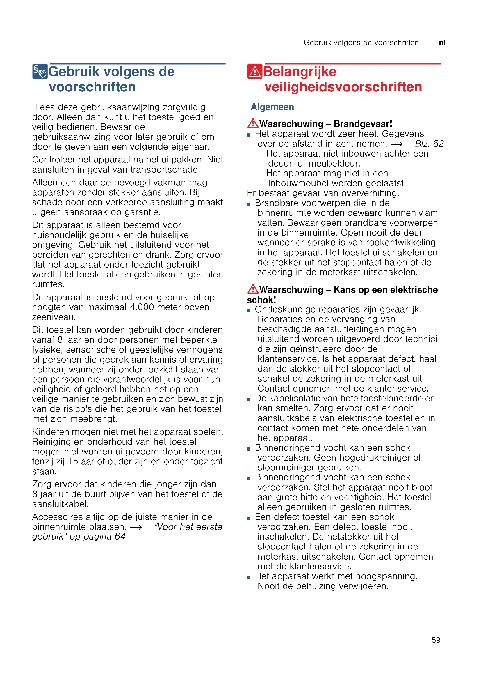 8Gebruik volgens de voorschriften Gebr ui k vol gens de voor schr i f t en Lees deze gebruiksaanwijzing zorgvuldig door. Alleen dan kunt u het toestel goed en veilig bedienen. Bewaar de gebruiksaanwijzing voor later gebruik of om door te geven aan een volgende eigenaar. Controleer het apparaat na het uitpakken. Niet aansluiten in geval van transportschade. Alleen een daartoe bevoegd vakman mag apparaten zonder stekker aansluiten. Bij schade door een verkeerde aansluiting maakt u geen aanspraak op garantie. Dit apparaat is alleen bestemd voor huishoudelijk gebruik en de huiselijke omgeving. Gebruik het uitsluitend voor het bereiden van gerechten en drank. Zorg ervoor dat het apparaat onder toezicht gebruikt wordt. Het toestel alleen gebruiken in gesloten ruimtes. Dit apparaat is bestemd voor gebruik tot op hoogten van maximaal 4.000 meter boven zeeniveau. Dit toestel kan worden gebruikt door kinderen vanaf 8 jaar en door personen met beperkte fysieke, sensorische of geestelijke vermogens of personen die gebrek aan kennis of ervaring hebben, wanneer zij onder toezicht staan van een persoon die verantwoordelijk is voor hun veiligheid of geleerd hebben het op een veilige manier te gebruiken en zich bewust zijn van de risico's die het gebruik van het toestel met zich meebrengt. Kinderen mogen niet met het apparaat spelen. Reiniging en onderhoud van het toestel mogen niet worden uitgevoerd door kinderen, tenzij zij 15 aar of ouder zijn en onder toezicht staan. Zorg ervoor dat kinderen die jonger zijn dan 8 jaar uit de buurt blijven van het toestel of de aansluitkabel. Accessoires altijd op de juiste manier in de binnenruimte plaatsen. ~ "Voor het eerste gebruik" op pagina 64 (Belangrijke veiligheidsvoorschriften Be l an g r i j k e vei l i ghei dsvoor s chr i f t en Algemeen :Waarschuwing – Brandgevaar! ■ Het apparaat wordt zeer heet. Gegevens over de afstand in acht nemen. ~ Blz. 62 – Het apparaat niet inbouwen achter een decor- of meubeldeur. – Het apparaat mag niet in een inbouwmeubel worden geplaatst. Er bestaat gevaar van oververhitting. Risico van brand! ■ Brandbare voorwerpen die in de binnenruimte worden bewaard kunnen vlam vatten. Bewaar geen brandbare voorwerpen in de binnenruimte. Open nooit de deur wanneer er sprake is van rookontwikkeling in het apparaat. Het toestel uitschakelen en de stekker uit het stopcontact halen of de zekering in de meterkast uitschakelen. :Waarschuwing – Kans op een elektrische schok! ■ Ondeskundige reparaties zijn gevaarlijk. Reparaties en de vervanging van beschadigde aansluitleidingen mogen uitsluitend worden uitgevoerd door technici die zijn geïnstrueerd door de klantenservice. Is het apparaat defect, haal dan de stekker uit het stopcontact of schakel de zekering in de meterkast uit. Contact opnemen met de klantenservice. Kans op een elektrische schok! ■ De kabelisolatie van hete toestelonderdelen kan smelten. Zorg ervoor dat er nooit aansluitkabels van elektrische toestellen in contact komen met hete onderdelen van het apparaat. Kans op een elektrische schok! ■ Binnendringend vocht kan een schok veroorzaken. Geen hogedrukreiniger of stoomreiniger gebruiken. Kans op een elektrische schok! ■ Binnendringend vocht kan een schok veroorzaken. Stel het apparaat nooit bloot aan grote hitte en vochtigheid. Het toestel alleen gebruiken in gesloten ruimtes. Kans op een elektrische schok! ■ Een defect toestel kan een schok veroorzaken. Een defect toestel nooit inschakelen. De netstekker uit het stopcontact halen of de zekering in de meterkast uitschakelen. Contact opnemen met de klantenservice. Kans op een elektrische schok! ■ Het apparaat werkt met hoogspanning. Nooit de behuizing verwijderen. Gevaar voor een elektrische schok!nl Belangrijke veiligheidsvoorschriften