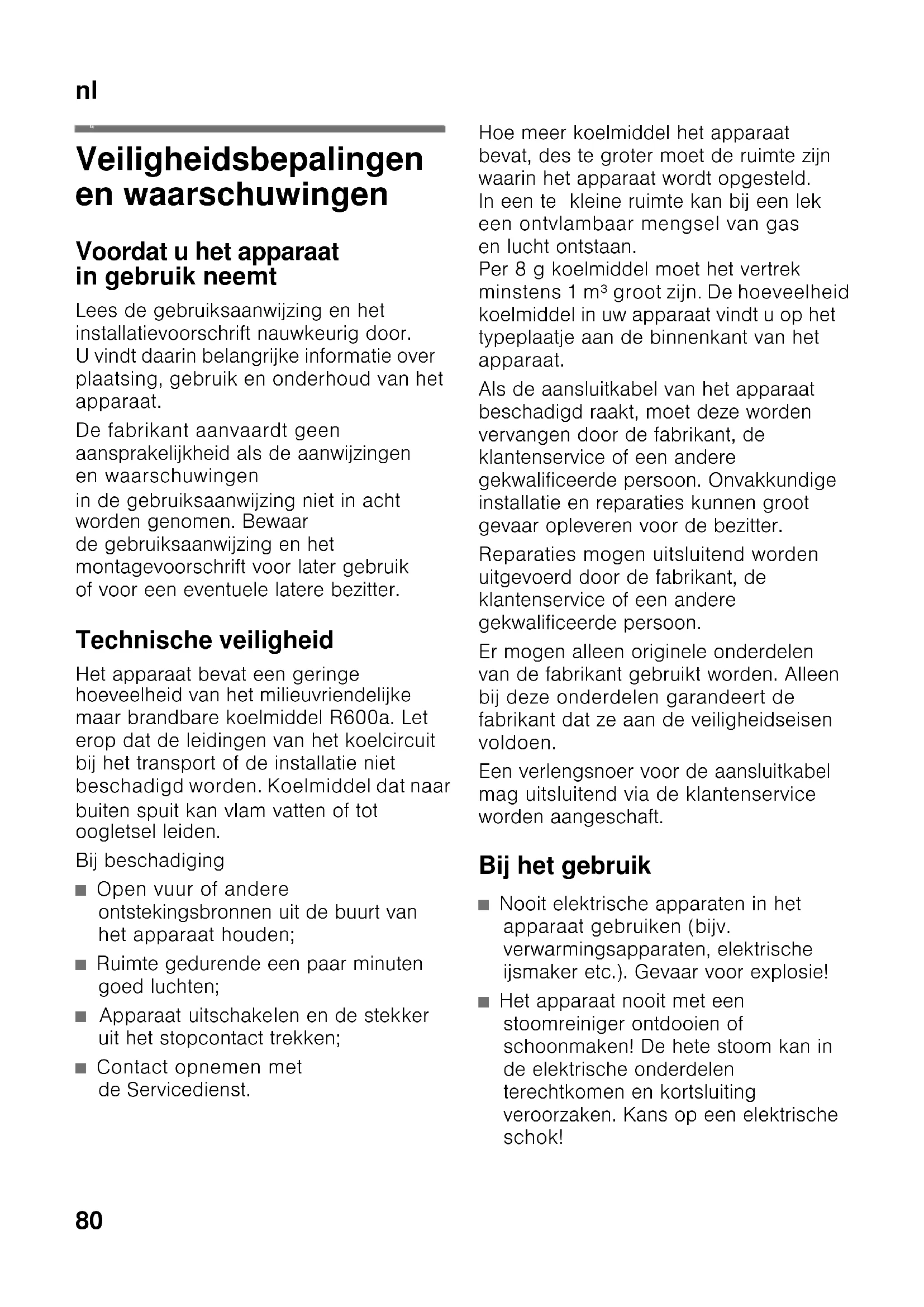 nlIn houd nlGebruiksaanwijzing Veiligheidsbepalingen en waarschuwingen Voordat u het apparaat in gebruik neemt Lees de gebruiksaanwijzing en het installatievoorschrift nauwkeurig door. U vindt daarin belangrijke informatie over plaatsing, gebruik en onderhoud van het apparaat. De fabrikant aanvaardt geen aansprakelijkheid als de aanwijzingen en waarschuwingen in de gebruiksaanwijzing niet in acht worden genomen. Bewaar de gebruiksaanwijzing en het montagevoorschrift voor later gebruik of voor een eventuele latere bezitter. Technische veiligheid Het apparaat bevat een geringe hoeveelheid van het milieuvriendelijke maar brandbare koelmiddel R600a. Let erop dat de leidingen van het koelcircuit bij het transport of de installatie niet beschadigd worden. Koelmiddel dat naar buiten spuit kan vlam vatten of tot oogletsel leiden. Bij beschadiging ■ Open vuur of andere ontstekingsbronnen uit de buurt van het apparaat houden; ■ Ruimte gedurende een paar minuten goed luchten; ■ Apparaat uitschakelen en de stekker uit het stopcontact trekken; ■ Contact opnemen met de Servicedienst. Hoe meer koelmiddel het apparaat bevat, des te groter moet de ruimte zijn waarin het apparaat wordt opgesteld. In een te kleine ruimte kan bij een lek een ontvlambaar mengsel van gas en lucht ontstaan. Per 8 g koelmiddel moet het vertrek minstens 1 m³ groot zijn. De hoeveelheid koelmiddel in uw apparaat vindt u op het typeplaatje aan de binnenkant van het apparaat. Als de aansluitkabel van het apparaat beschadigd raakt, moet deze worden vervangen door de fabrikant, de klantenservice of een andere gekwalificeerde persoon. Onvakkundige installatie en reparaties kunnen groot gevaar opleveren voor de bezitter. Reparaties mogen uitsluitend worden uitgevoerd door de fabrikant, de klantenservice of een andere gekwalificeerde persoon. Er mogen alleen originele onderdelen van de fabrikant gebruikt worden. Alleen bij deze onderdelen garandeert de fabrikant dat ze aan de veiligheidseisen voldoen. Een verlengsnoer voor de aansluitkabel mag uitsluitend via de klantenservice worden aangeschaft. Bij het gebruik ■ Nooit elektrische apparaten in het apparaat gebruiken (bijv. verwarmingsapparaten, elektrische ijsmaker etc.). Gevaar voor explosie! ■ Het apparaat nooit met een stoomreiniger ontdooien of schoonmaken! De hete stoom kan in de elektrische onderdelen terechtkomen en kortsluiting veroorzaken. Kans op een elektrische schok!nl