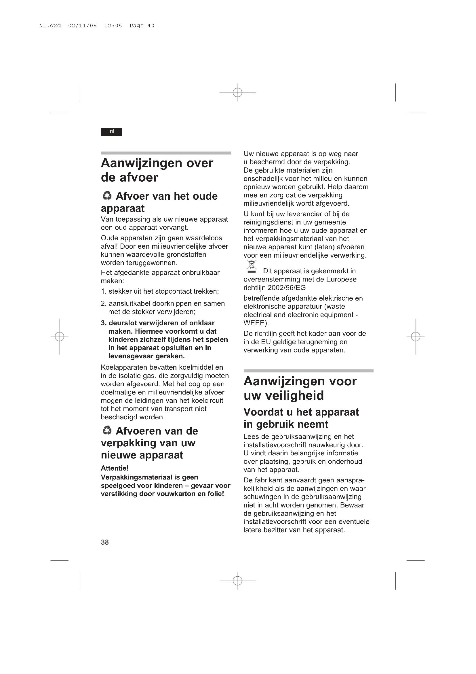 maken. Hiermee voorkomt u dat kinderen zichzelf tijdens het spelen in het apparaat opsluiten en in levensgevaar geraken. Koelapparaten bevatten koelmiddel en in de isolatie gas. die zorgvuldig moeten worden afgevoerd. Met het oog op een doelmatige en milieuvriendelijke afvoer mogen de leidingen van het koelcircuit tot het moment van transport niet beschadigd worden. Afvoeren van de verpakking van uw nieuwe apparaat Attentie! Verpakkingsmateriaal is geen speelgoed voor kinderen – gevaar voor verstikking door vouwkarton en folie! NL.qxd 02/11/05 12:05 Page 40nl Attentie!