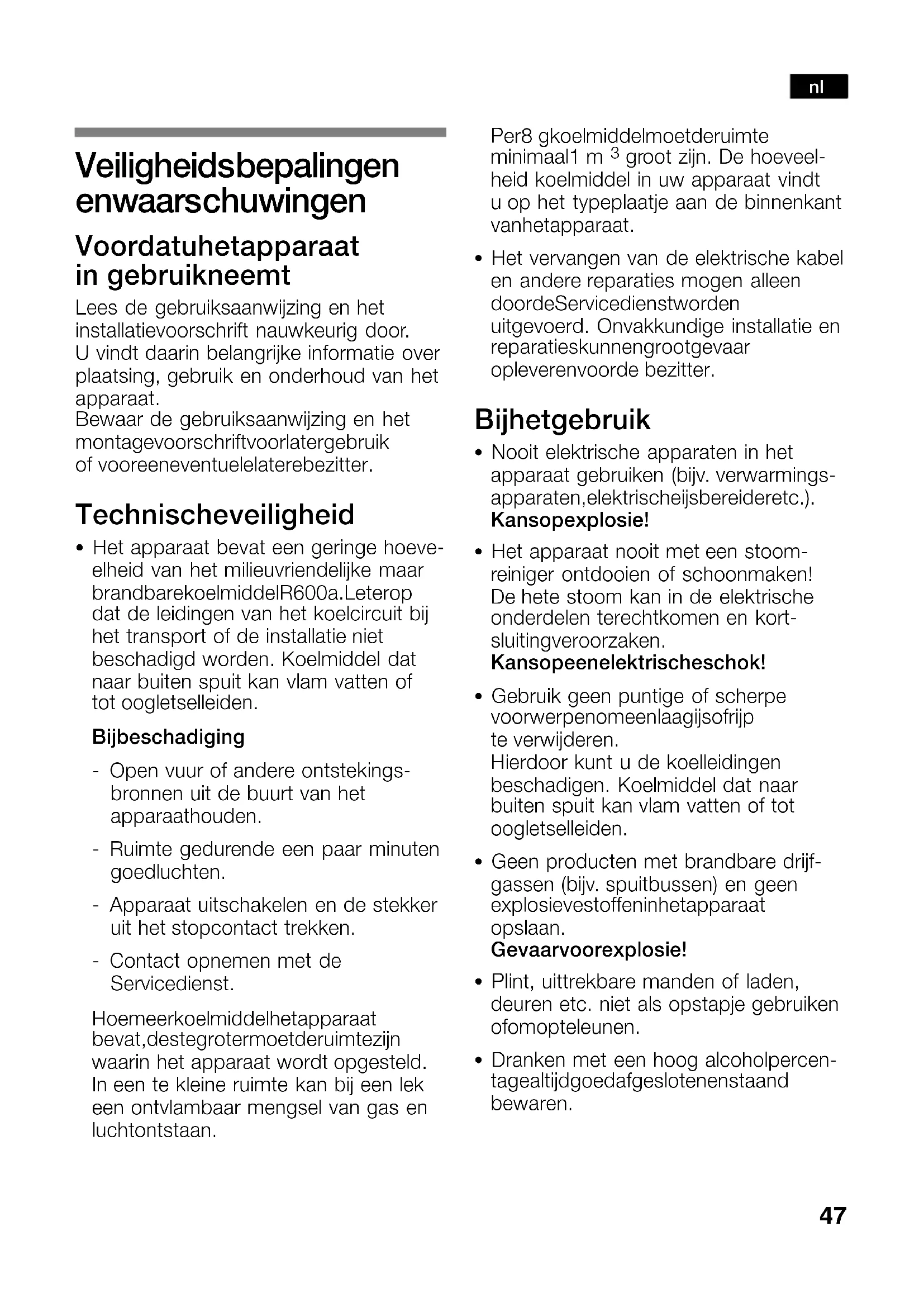 groot zijn. De hoeveel heid koelmiddel in uw apparaat vindt uop het typeplaatje aan de binnenkant van het apparaat. S Het vervangen van de elektrische kabel en andere reparaties mogen alleen door de Servicedienst worden uitgevoerd. Onvakkundige installatie en reparaties kunnen groot gevaar opleveren voor debezitter. Bij het gebruik S Nooit elektrische apparaten in het apparaat gebruiken (bijv.verwarmings apparaten, elektrische ijsbereider etc.). Kans op explosie! S Het apparaat nooit met een stoom reiniger ontdooien of schoonmaken! Dehete stoom kan in de elektrische onderdelen terechtkomen en kort sluiting veroorzaken. Kans op een elektrische schok! S Gebruik geen puntige of scherpe voorwerpen om een laag ijs of rijp teverwijderen. Hierdoor kunt u de koelleidingen beschadigen. Koelmiddel dat naar buiten spuit kan vlam vatten of tot oogletsel leiden. S Geen producten met brandbare drijf gassen (bijv.spuitbussen) en geen explosieve stoffen in het apparaat opslaan. Gevaar voor explosie! S Plint, uittrekbare manden of laden, deuren etc. niet als opstapje gebruiken of om op te leunen. S Dranken met een hoog alcoholpercen tage altijd goed afgesloten en staand bewaren. nl48 S Om te ontdooien of te reinigen het apparaat uitschakelen, stekker uit het stopcontact trekken of de zekering uitschakelen resp. losdraaien. Altijd aan de stekker trekken, nooit aande aansluitkabel. S Zorg dat de kunststof delen en de deurafdichting niet met olie of vet in aanraking komen. Ze kunnen poreus worden. S De be en ontluchtingsopeningen van het apparaat nooit afdekken. S Dit apparaat mag door personen met beperkte lichamelijke of geestelijke vermogens, motorische storingen of gebrekkige kennis alleen onder toezicht ofna uitvoerige instructie gebruikt worden. Kinderen in het huishouden S Verpakkingsmateriaal en onderdelen ervan zijn geen speelgoed voor kinderen. Verstikkingsgevaar door opvouwbare kartonnen dozen en folie! S Het apparaat is geen speelgoed voor kinderen! S Bij een apparaat met deurslot: sleutel buiten het bereik van kinderen bewaren! Algemene bepalingen Dit apparaat is uitsluitend bedoeld voor het bewaren van wijn. Dit apparaat is bedoeld voor huishoudelijk gebruik door particulieren en thuisgebruik. Het apparaat is ontstoord volgens EU− richtlijn 2004/108/EC. Het koelcircuit is op dichtheid gecontroleerd. Dit apparaat voldoet aan de veiligheidsbepalingen voor elektrische apparaten (EN 60335/2/24). Aanwijzingen over de afvoer x Afvoeren van de verpakking van uw nieuwe apparaat De verpakking beschermt uw apparaat tegen transportschade. De gebruikte materialen zijn onschadelijk voor het milieu en kunnen opnieuw worden gebruikt. Help daarom mee en zorg datde verpakking milieuvriendelijk wordt afgevoerd. U kunt bij uw leverancier of bij de reinigingsdienst in uw gemeente informeren hoe u uw oude apparaat enhet verpakkingsmateriaal van het nieuwe apparaat kunt (laten) afvoeren voor een milieuvriendelijke verwerking. nl49 x Afvoer van het oude apparaat Oude apparaten zijn geen waardeloos afval! Door een milieuvriendelijke afvoer kunnen waardevolle grondstoffen worden teruggewonnen. Dit apparaat is gekenmerkt in overeenstemming met de Europese richtlijn 2002/96/EG betreffende afgedankte elektrische en elektronische apparatuur (waste electrical and electronic equipment WEEE). De richtlijn geeft het kader aan voor de in de EU geldige terugneming en verwerking van oude apparaten.