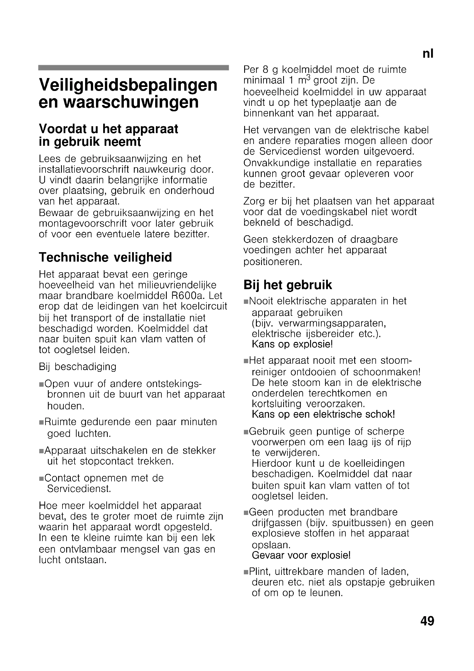 Het apparaat bevat een geringe hoeveelheid van het milieuvriendelijk maar brandbare koelmiddel R600a. Let erop dat de leidingen van het koelcircuit bij het transport of de installmentie nicht beschadigd worden. Koelmiddel dat waar buiten spuit kan vlam vatten of tot oogletsel leiden.