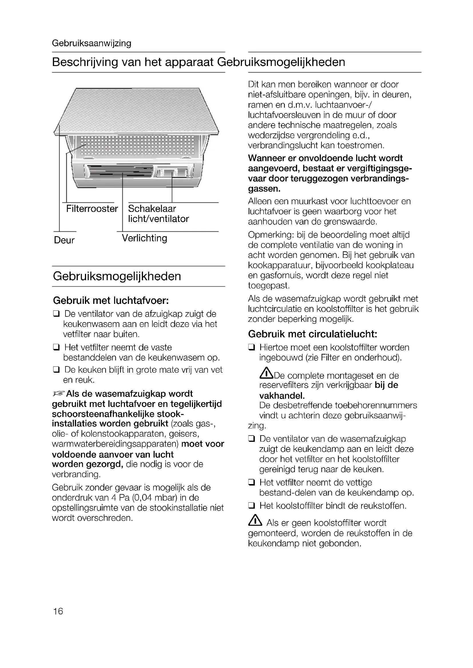 Als de wasemafzuigkap wordt gebruikt met luchtafvoer en tegelijkertijd schoorsteenafhankelijke stook- installaties worden gebruikt (zoals gas-, olie- of kolenstookapparaten, geisers, warmwaterbereidingsapparaten) moet voor voldoende aanvoer van lucht worden gezorgd, die nodig is voor de verbranding. Gebruik zonder gevaar is mogelijk als de onderdruk van 4 Pa (0,04 mbar) in de opstellingsruimte van de stookinstallatie niet wordt overschreden. Dit kan men bereiken wanneer er door niet-afsluitbare openingen, bijv. in deuren, ramen en d.m.v. luchtaanvoer-/luchtafvo- ersleuven in de muur of door andere techni- sche maatregelen, zoals wederzijdse ver- grendeling e.d., verbrandingslucht kan toestromen. Wanneer er onvoldoende lucht wordt aangevoerd, bestaat er vergiftigingsge- vaar door teruggezogen verbrandings- gassen. Alleen een muurkast voor luchttoevoer en luchtafvoer is geen waarborg voor het aanhouden van de grenswaarde. Opmerking: bij de beoordeling moet altijd de complete ventilatie van de woning in acht worden genomen. Bij het gebruik van kookapparatuur, bijvoorbeeld kookplateau en gasfornuis, wordt deze regel niet toegepast. Als de wasemafzuigkap wordt gebruikt met luchtcirculatie en actieve-koolfilter is het gebruik zonder beperking mogelijk. Bij gebruik met luchtafvoer moet een terugslagklep worden ingebouwd, indien deze niet in de luchtafvoerpijp of muurkast aanwezig is. Wanneer bij het apparaat geen terugslag- klep is gevoegd, kan deze worden verkre- gen in de vakhandel (zie speciaal toebeho- ren in de gebruiksaanwijzing).