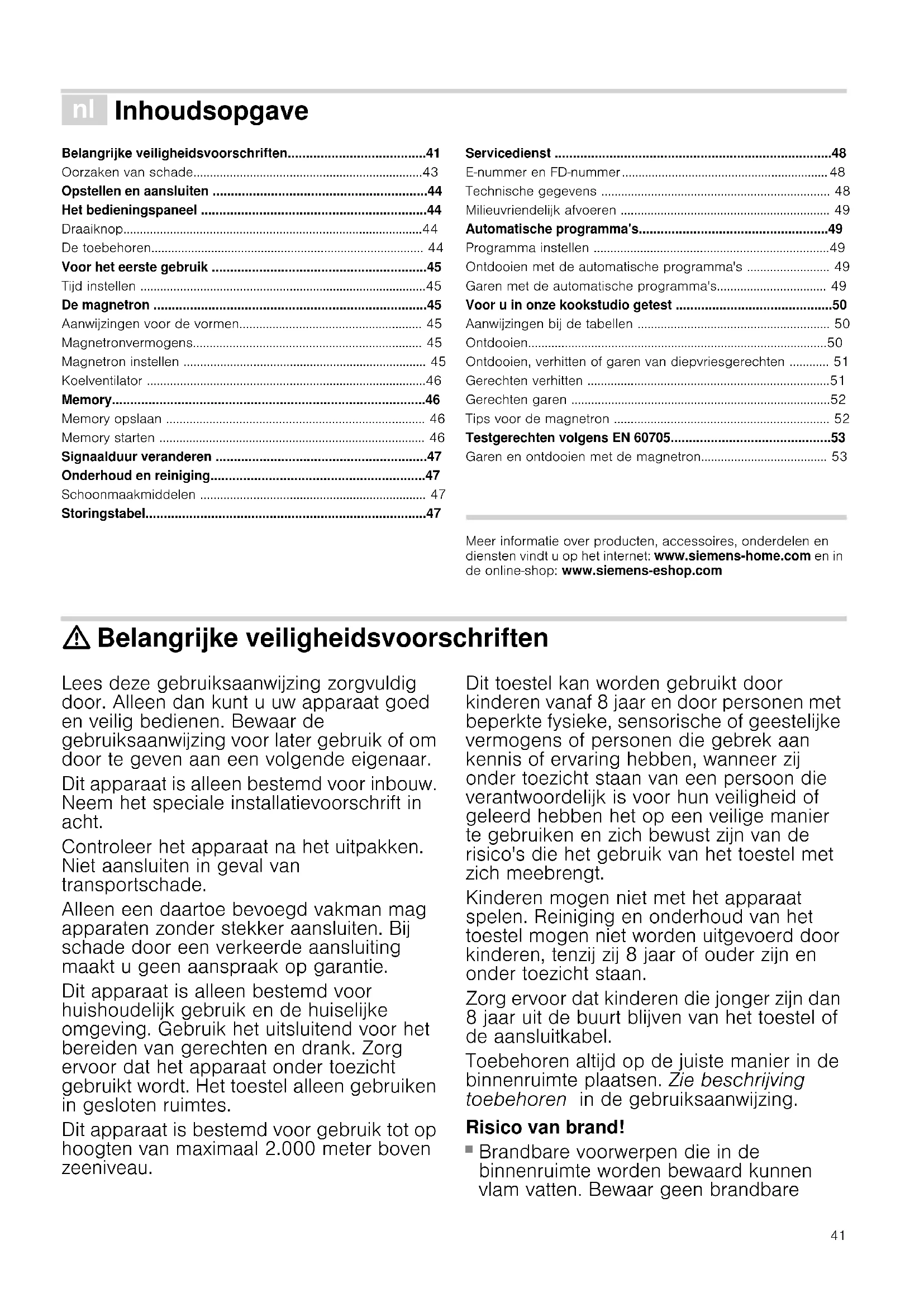 Levensmiddelen kunnen vlam vatten. Nooit levensmiddelen opwarmen in verpakkingen die bestemd zijn om ze warm te houden. Levensmiddelen nooit zonder toezicht verwarmen in voorwerpen van kunststof, papier of ander brandbaar materiaal. Bij de magnetron nooit een te groot vermogen of te lange tijdsduur instellen. Houd u aan de opgaven in deze gebruiksaanwijzing. Nooit levensmiddelen drogen met de magnetron. Nooit levensmiddelen met weinig water, zoals bijv. brood, met een te hoog magnetronvermogen of te lange -tijd ontdooien of verwarmen. Risico van brand!