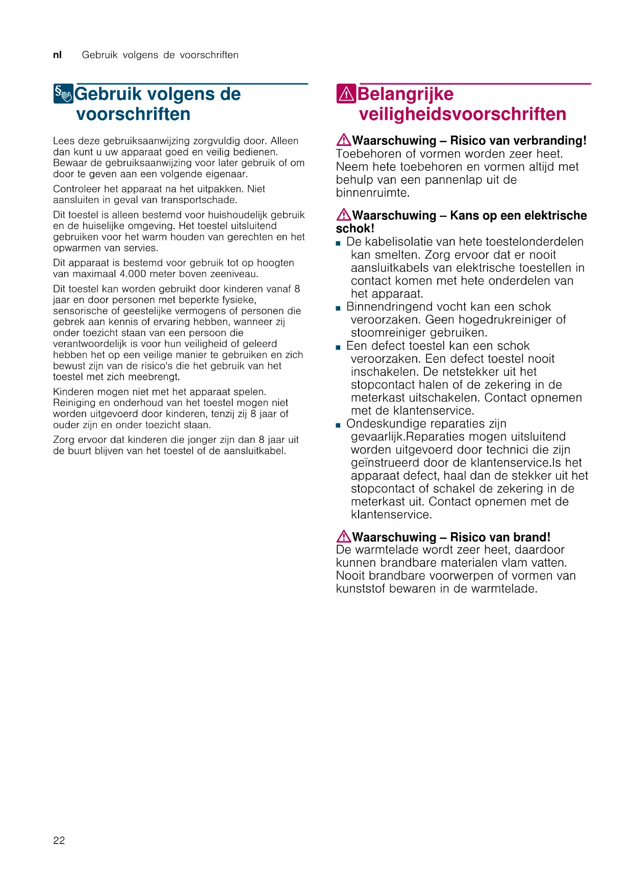 8Gebruik volgens de voorschriften Gebruik volgens de voorschriften Lees deze gebruiksaanwijzing zorgvuldig door. Alleen dan kunt u uw apparaat goed en veilig bedienen. Bewaar de gebruiksaanwijzing voor later gebruik of om door te geven aan een volgende eigenaar. Controleer het apparaat na het uitpakken. Niet aansluiten in geval van transportschade. Dit toestel is alleen bestemd voor huishoudelijk gebruik en de huiselijke omgeving. Het toestel uitsluitend gebruiken voor het warm houden van gerechten en het opwarmen van servies. Dit apparaat is bestemd voor gebruik tot op hoogten van maximaal 4.000 meter boven zeeniveau. Dit toestel kan worden gebruikt door kinderen vanaf 8 jaar en door personen met beperkte fysieke, sensorische of geestelijke vermogens of personen die gebrek aan kennis of ervaring hebben, wanneer zij onder toezicht staan van een persoon die verantwoordelijk is voor hun veiligheid of geleerd hebben het op een veilige manier te gebruiken en zich bewust zijn van de risico's die het gebruik van het toestel met zich meebrengt. Kinderen mogen niet met het apparaat spelen. Reiniging en onderhoud van het toestel mogen niet worden uitgevoerd door kinderen, tenzij zij 8 jaar of ouder zijn en onder toezicht staan. Zorg ervoor dat kinderen die jonger zijn dan 8 jaar uit de buurt blijven van het toestel of de aansluitkabel. (Belangrijke veiligheidsvoorschriften Belangrijke veiligheidsvoorschriften :Waarschuwing – Risico van verbranding! Toebehoren of vormen worden zeer heet. Neem hete toebehoren en vormen altijd met behulp van een pannenlap uit de binnenruimte. :Waarschuwing – Kans op een elektrische schok! ■ De kabelisolatie van hete toestelonderdelen kan smelten. Zorg ervoor dat er nooit aansluitkabels van elektrische toestellen in contact komen met hete onderdelen van het apparaat. Kans op een elektrische schok! ■ Binnendringend vocht kan een schok veroorzaken. Geen hogedrukreiniger of stoomreiniger gebruiken. Kans op een elektrische schok! ■ Een defect toestel kan een schok veroorzaken. Een defect toestel nooit inschakelen. De netstekker uit het stopcontact halen of de zekering in de meterkast uitschakelen. Contact opnemen met de klantenservice. Kans op een elektrische schok! ■ Ondeskundige reparaties zijn gevaarlijk.Reparaties mogen uitsluitend worden uitgevoerd door technici die zijn geïnstrueerd door de klantenservice.Is het apparaat defect, haal dan de stekker uit het stopcontact of schakel de zekering in de meterkast uit. Contact opnemen met de klantenservice. :Waarschuwing – Risico van brand! De warmtelade wordt zeer heet, daardoor kunnen brandbare materialen vlam vatten. Nooit brandbare voorwerpen of vormen van kunststof bewaren in de warmtelade.Het apparaat leren kennen nl