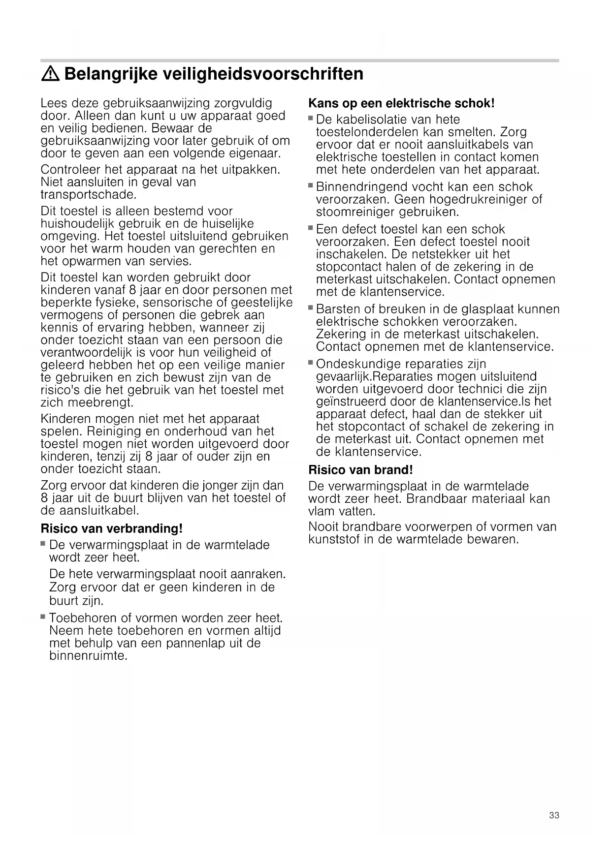- Milieuvriendelijke afvalverwerking Produktinfo Meer informatie over producten, accessoires, onderdelen en diensten vindt u op het internet: www.siemens-home.com en in de online-shop: www.siemens-eshop.com33 : Belangrijke veiligheidsvoorschriften Lees deze gebruiksaanwijzing zorgvuldig door. Alleen dan kunt u uw apparaat goed en veilig bedienen. Bewaar de gebruiksaanwijzing voor later gebruik of om door te geven aan een volgende eigenaar. Controleer het apparaat na het uitpakken. Niet aansluiten in geval van transportschade. Dit toestel is alleen bestemd voor huishoudelijk gebruik en de huiselijke omgeving. Het toestel uitsluitend gebruiken voor het warm houden van gerechten en het opwarmen van servies. Dit toestel kan worden gebruikt door kinderen vanaf 8 jaar en door personen met beperkte fysieke, sensorische of geestelijke vermogens of personen die gebrek aan kennis of ervaring hebben, wanneer zij onder toezicht staan van een persoon die verantwoordelijk is voor hun veiligheid of geleerd hebben het op een veilige manier te gebruiken en zich bewust zijn van de risico's die het gebruik van het toestel met zich meebrengt. Kinderen mogen niet met het apparaat spelen. Reiniging en onderhoud van het toestel mogen niet worden uitgevoerd door kinderen, tenzij zij 8 jaar of ouder zijn en onder toezicht staan. Zorg ervoor dat kinderen die jonger zijn dan 8 jaar uit de buurt blijven van het toestel of de aansluitkabel. Risico van verbranding! p. 37