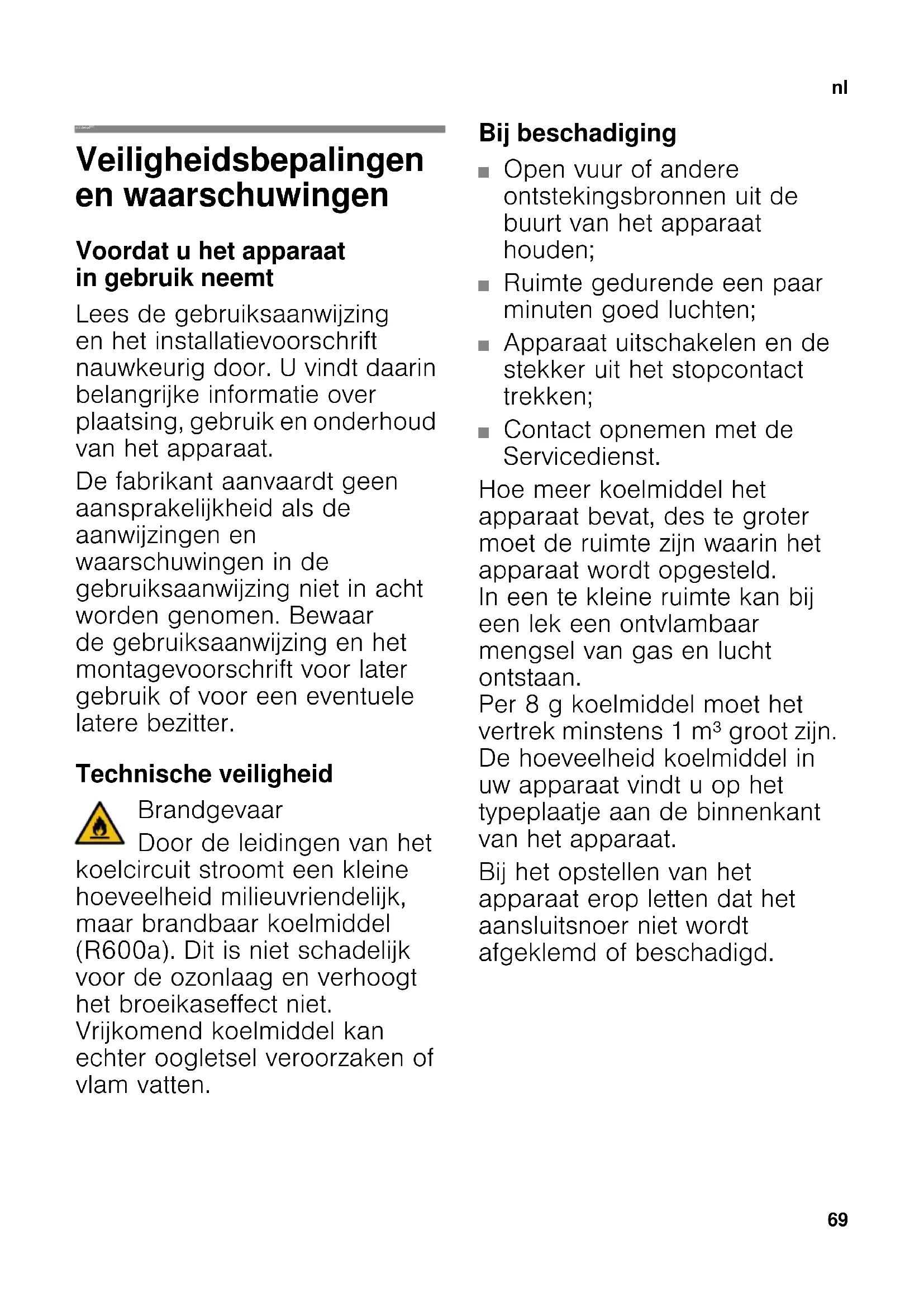 nlInhoud nlGebruiksaanwijzing Veiligheidsbepalingen en waarschuwingen Voordat u het apparaat in gebruik neemt Lees de gebruiksaanwijzing en het installatievoorschrift nauwkeurig door. U vindt daarin belangrijke informatie over plaatsing, gebruik en onderhoud van het apparaat. De fabrikant aanvaardt geen aansprakelijkheid als de aanwijzingen en waarschuwingen in de gebruiksaanwijzing niet in acht worden genomen. Bewaar de gebruiksaanwijzing en het montagevoorschrift voor later gebruik of voor een eventuele latere bezitter. Technische veiligheid Brandgevaar Door de leidingen van het koelcircuit stroomt een kleine hoeveelheid milieuvriendelijk, maar brandbaar koelmiddel (R600a). Dit is niet schadelijk voor de ozonlaag en verhoogt het broeikaseffect niet. Vrijkomend koelmiddel kan echter oogletsel veroorzaken of vlam vatten. Bij beschadiging ■ Open vuur of andere ontstekingsbronnen uit de buurt van het apparaat houden; ■ Ruimte gedurende een paar minuten goed luchten; ■ Apparaat uitschakelen en de stekker uit het stopcontact trekken; ■ Contact opnemen met de Servicedienst. Hoe meer koelmiddel het apparaat bevat, des te groter moet de ruimte zijn waarin het apparaat wordt opgesteld. In een te kleine ruimte kan bij een lek een ontvlambaar mengsel van gas en lucht ontstaan. Per 8 g koelmiddel moet het vertrek minstens 1 m³ groot zijn. De hoeveelheid koelmiddel in uw apparaat vindt u op het typeplaatje aan de binnenkant van het apparaat. Bij het opstellen van het apparaat erop letten dat het aansluitsnoer niet wordt afgeklemd of beschadigd.nl