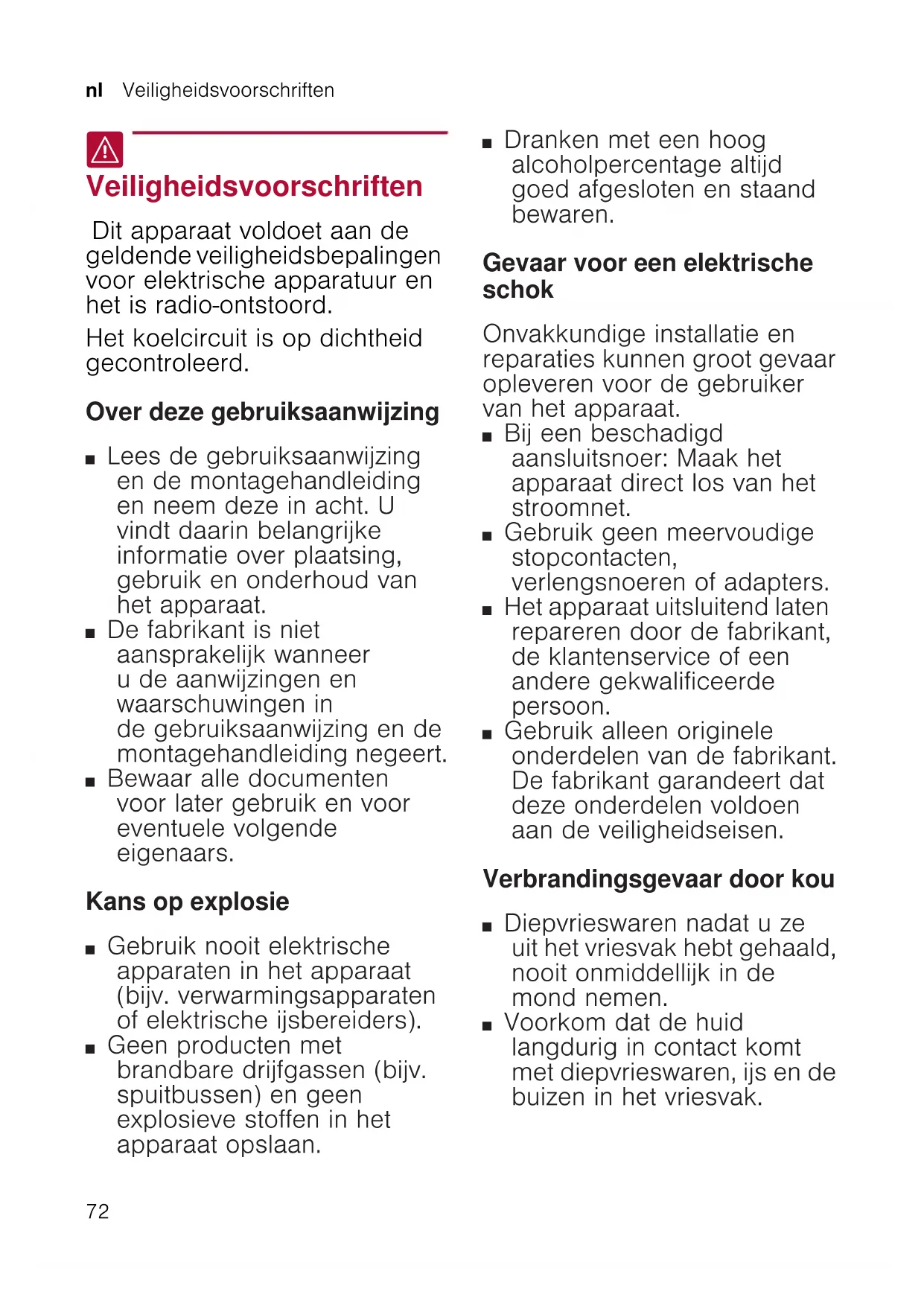 Veiligheidsvoorschriften Vei l i ghei dsv oor sc hr i f t en Dit apparaat voldoet aan de geldende veiligheidsbepalingen voor elektrische apparatuur en het is radio-ontstoord. Het koelcircuit is op dichtheid gecontroleerd. Over deze gebruiksaanwijzing ■ Lees de gebruiksaanwijzing en de montagehandleiding en neem deze in acht. U vindt daarin belangrijke informatie over plaatsing, gebruik en onderhoud van het apparaat. ■ De fabrikant is niet aansprakelijk wanneer u de aanwijzingen en waarschuwingen in de gebruiksaanwijzing en de montagehandleiding negeert. ■ Bewaar alle documenten voor later gebruik en voor eventuele volgende eigenaars. Kans op explosie ■ Gebruik nooit elektrische apparaten in het apparaat (bijv. verwarmingsapparaten of elektrische ijsbereiders). ■ Geen producten met brandbare drijfgassen (bijv. spuitbussen) en geen explosieve stoffen in het apparaat opslaan. ■ Dranken met een hoog alcoholpercentage altijd goed afgesloten en staand bewaren. Gevaar voor een elektrische schok Onvakkundige installatie en reparaties kunnen groot gevaar opleveren voor de gebruiker van het apparaat. ■ Bij een beschadigd aansluitsnoer: Maak het apparaat direct los van het stroomnet. ■ Gebruik geen meervoudige stopcontacten, verlengsnoeren of adapters. ■ Het apparaat uitsluitend laten repareren door de fabrikant, de klantenservice of een andere gekwalificeerde persoon. ■ Gebruik alleen originele onderdelen van de fabrikant. De fabrikant garandeert dat deze onderdelen voldoen aan de veiligheidseisen. Verbrandingsgevaar door kou ■ Diepvrieswaren nadat u ze uit het vriesvak hebt gehaald, nooit onmiddellijk in de mond nemen. ■ Voorkom dat de huid langdurig in contact komt met diepvrieswaren, ijs en de buizen in het vriesvak.Veiligheidsvoorschriften nl