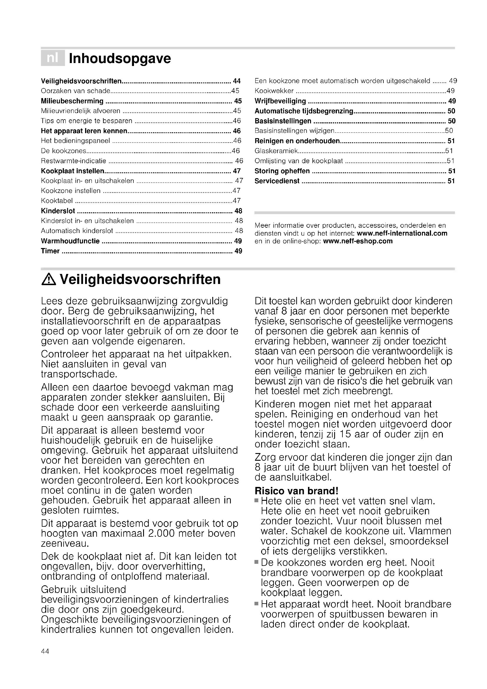 - No colocar ningún recipiente caliente sobre el panel de mando E 902 406 41644 é Inhoudsopgave [nl]Gebruiksaanwij zing Veiligheidsvoorschriften......................................................... 44 Oorzaken van schade.....................................................................45 Milieubescherming .................................................................. 45 Milieuvriendelijk afvoeren ...............................................................45 Tips om energie te besparen ........................................................46 Het apparaat leren kennen...................................................... 46 Het bedieningspaneel .....................................................................46 De kookzones...................................................................................46 Restwarmte-indicatie ....................................................................... 46 Kookplaat instellen.................................................................. 47 Kookplaat in- en uitschakelen ....................................................... 47 Kookzone instellen ..........................................................................47 Kooktabel ..........................................................................................47 Kinderslot ................................................................................. 48 Kinderslot in- en uitschakelen ....................................................... 48 Automatisch kinderslot ................................................................... 48 Warmhoudfunctie .................................................................... 49 Timer ......................................................................................... 49 Een kookzone moet automatisch worden uitgeschakeld ........ 49 Kookwekker ......................................................................................49 Wrijfbeveiliging ........................................................................ 49 Automatische tijdsbegrenzing................................................ 50 Basisinstellingen ..................................................................... 50 Basisinstellingen wijzigen...............................................................50 Reinigen en onderhouden....................................................... 51 Glaskeramiek....................................................................................51 Omlijsting van de kookplaat ..........................................................51 Storing opheffen ...................................................................... 51 Servicedienst ........................................................................... 51 Produktinfo Meer informatie over producten, accessoires, onderdelen en diensten vindt u op het internet: www.neff-international.com en in de online-shop: www.neff-eshop.com : Veiligheidsvoorschriften Lees deze gebruiksaanwijzing zorgvuldig door. Berg de gebruiksaanwijzing, het installatievoorschrift en de apparaatpas goed op voor later gebruik of om ze door te geven aan volgende eigenaren. Controleer het apparaat na het uitpakken. Niet aansluiten in geval van transportschade. Alleen een daartoe bevoegd vakman mag apparaten zonder stekker aansluiten. Bij schade door een verkeerde aansluiting maakt u geen aanspraak op garantie. Dit apparaat is alleen bestemd voor huishoudelijk gebruik en de huiselijke omgeving. Gebruik het apparaat uitsluitend voor het bereiden van gerechten en dranken. Het kookproces moet regelmatig worden gecontroleerd. Een kort kookproces moet continu in de gaten worden gehouden. Gebruik het apparaat alleen in gesloten ruimtes. Dit apparaat is bestemd voor gebruik tot op hoogten van maximaal 2.000 meter boven zeeniveau. Dek de kookplaat niet af. Dit kan leiden tot ongevallen, bijv. door oververhitting, ontbranding of ontploffend materiaal. Gebruik uitsluitend beveiligingsvoorzieningen of kindertralies die door ons zijn goedgekeurd. Ongeschikte beveiligingsvoorzieningen of kindertralies kunnen tot ongevallen leiden. Dit toestel kan worden gebruikt door kinderen vanaf 8 jaar en door personen met beperkte fysieke, sensorische of geestelijke vermogens of personen die gebrek aan kennis of ervaring hebben, wanneer zij onder toezicht staan van een persoon die verantwoordelijk is voor hun veiligheid of geleerd hebben het op een veilige manier te gebruiken en zich bewust zijn van de risico's die het gebruik van het toestel met zich meebrengt. Kinderen mogen niet met het apparaat spelen. Reiniging en onderhoud van het toestel mogen niet worden uitgevoerd door kinderen, tenzij zij 15 aar of ouder zijn en onder toezicht staan. Zorg ervoor dat kinderen die jonger zijn dan 8 jaar uit de buurt blijven van het toestel of de aansluitkabel. Risico van brand!