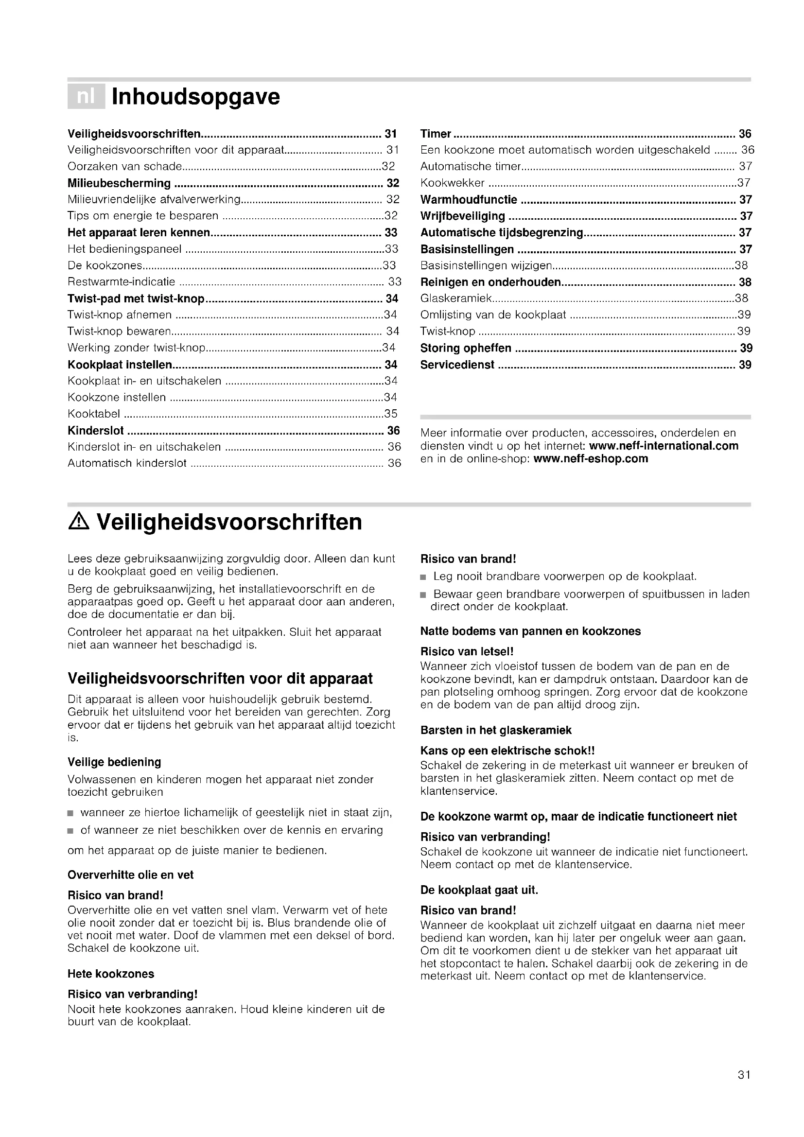 - Do not place hot pans close to or on the control panel GB 0844 8928989 Calls from a BT landline will be charged at up to 3 pence per minute. A call set-up fee of up to 6 pence may apply. IE 01450 265531 é Inhoudsopgave Veiligheidsvoorschriften......................................................... 31 Veiligheidsvoorschriften voor dit apparaat.................................. 31 Oorzaken van schade.....................................................................32 Milieubescherming .................................................................. 32 Milieuvriendelijke afvalverwerking................................................. 32 Tips om energie te besparen ........................................................32 Het apparaat leren kennen...................................................... 33 Het bedieningspaneel .....................................................................33 De kookzones...................................................................................33 Restwarmte-indicatie ....................................................................... 33 Twistpad met twistknop........................................................ 34 Twistknop afnemen ........................................................................34 Twistknop bewaren......................................................................... 34 Werking zonder twist-knop.............................................................34 Kookplaat instellen.................................................................. 34 Kookplaat in- en uitschakelen .......................................................34 Kookzone instellen ..........................................................................34 Kooktabel ..........................................................................................35 Kinderslot ................................................................................. 36 Kinderslot in- en uitschakelen ....................................................... 36 Automatisch kinderslot ................................................................... 36 Timer ......................................................................................... 36 Een kookzone moet automatisch worden uitgeschakeld ........ 36 Automatische timer.......................................................................... 37 Kookwekker ......................................................................................37 Warmhoudfunctie .................................................................... 37 Wrijfbeveiliging ........................................................................ 37 Automatische tijdsbegrenzing................................................ 37 Basisinstellingen ..................................................................... 37 Basisinstellingen wijzigen...............................................................38 Reinigen en onderhouden....................................................... 38 Glaskeramiek....................................................................................38 Omlijsting van de kookplaat ..........................................................39 Twistknop .........................................................................................39 Storing opheffen ...................................................................... 39 Servicedienst ........................................................................... 39 Produktinfo Meer informatie over producten, accessoires, onderdelen en diensten vindt u op het internet: www.neff-international.com en in de online-shop: www.neff-eshop.com m Veiligheidsvoorschriften Lees deze gebruiksaanwijzing zorgvuldig door. Alleen dan kunt u de kookplaat goed en veilig bedienen. Berg de gebruiksaanwijzing, het installatievoorschrift en de apparaatpas goed op. Geeft u het apparaat door aan anderen, doe de documentatie er dan bij. Controleer het apparaat na het uitpakken. Sluit het apparaat niet aan wanneer het beschadigd is. Veiligheidsvoorschriften voor dit apparaat Dit apparaat is alleen voor huishoudelijk gebruik bestemd. Gebruik het uitsluitend voor het bereiden van gerechten. Zorg ervoor dat er tijdens het gebruik van het apparaat altijd toezicht is. Veilige bediening Volwassenen en kinderen mogen het apparaat niet zonder toezicht gebruiken ■ wanneer ze hiertoe lichamelijk of geestelijk niet in staat zijn, ■ of wanneer ze niet beschikken over de kennis en ervaring om het apparaat op de juiste manier te bedienen. Oververhitte olie en vet Risico van brand! Oververhitte olie en vet vatten snel vlam. Verwarm vet of hete olie nooit zonder dat er toezicht bij is. Blus brandende olie of vet nooit met water. Doof de vlammen met een deksel of bord. Schakel de kookzone uit. Hete kookzones Risico van verbranding! Nooit hete kookzones aanraken. Houd kleine kinderen uit de buurt van de kookplaat. Risico van brand! ■ Leg nooit brandbare voorwerpen op de kookplaat. ■ Bewaar geen brandbare voorwerpen of spuitbussen in laden direct onder de kookplaat. Natte bodems van pannen en kookzones Risico van letsel! Wanneer zich vloeistof tussen de bodem van de pan en de kookzone bevindt, kan er dampdruk ontstaan. Daardoor kan de pan plotseling omhoog springen. Zorg ervoor dat de kookzone en de bodem van de pan altijd droog zijn. Barsten in het glaskeramiek Kans op een elektrische schok!! Schakel de zekering in de meterkast uit wanneer er breuken of barsten in het glaskeramiek zitten. Neem contact op met de klantenservice. De kookzone warmt op, maar de indicatie functioneert niet Risico van verbranding! Schakel de kookzone uit wanneer de indicatie niet functioneert. Neem contact op met de klantenservice. De kookplaat gaat uit. Risico van brand! Wanneer de kookplaat uit zichzelf uitgaat en daarna niet meer bediend kan worden, kan hij later per ongeluk weer aan gaan. Om dit te voorkomen dient u de stekker van het apparaat uit het stopcontact te halen. Schakel daarbij o