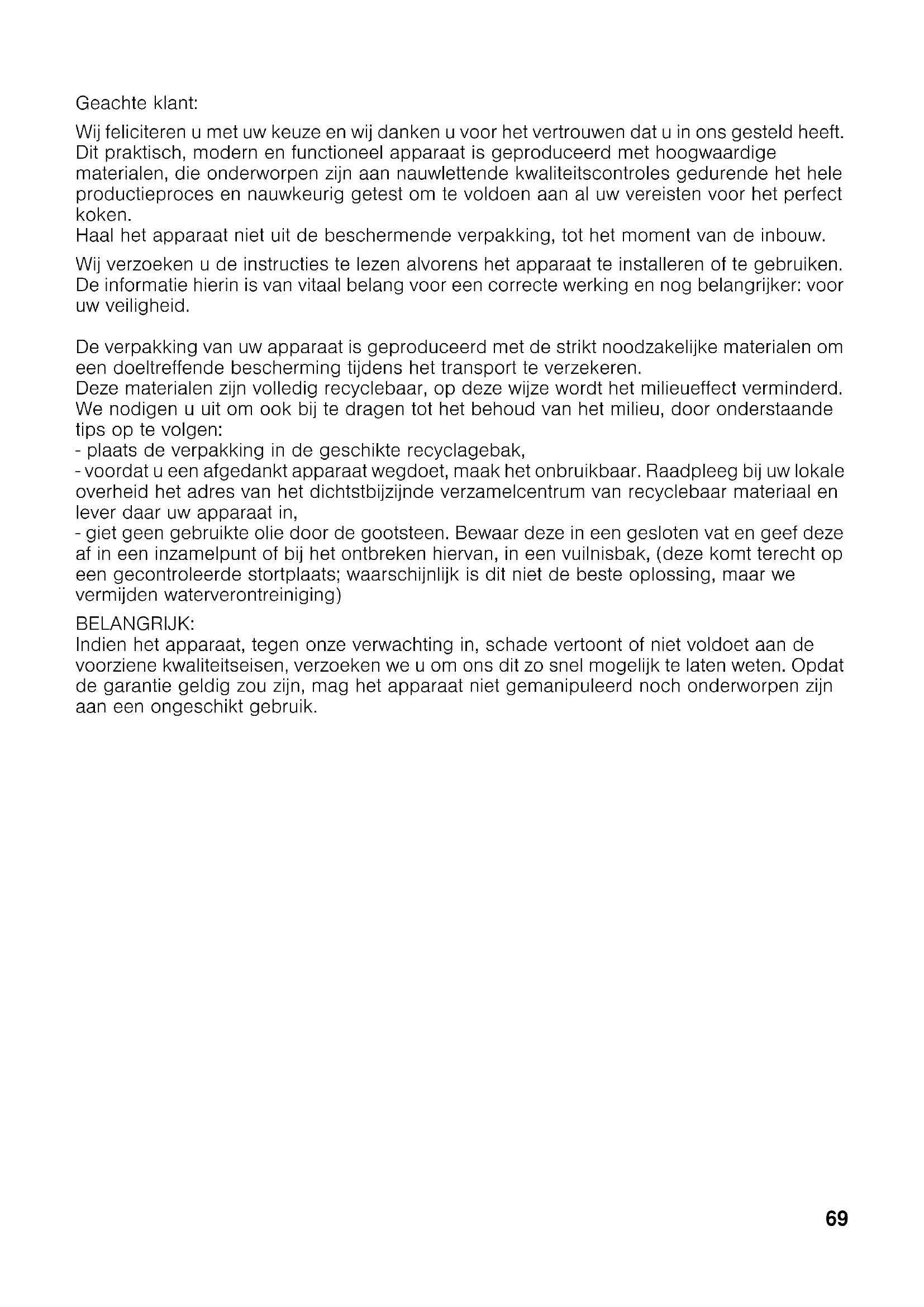 - Indien er resten op blijven (aangekoekt voedsel, vetdruppels, enz.), hoe klein ook, zetten deze zicht vast op het oppervlak en zullen deze later moeilijk te verwijderen zijn. De openingen en gleuven moeten zuiver zijn, opdat de vlam correct zou zijn. De beweging van sommige pannen kan metaalresten achterlaten op de roosters. Reinig de branders en de roosters met zeepsop en wrijf erover met een niet-metalen borstel. Indien de roosters rubber voetjes hebben, wees voorzichtig bij het reinigen hiervan. De voetjes kunnen losraken en het rooster kan de kookplaat krassen. Droog de branders en de roosters altijd volledig. De aanwezigheid van waterdruppels of vochtige zones bij de aanvang van het koken kan het email beschadigen. Na het reinigen en drogen van de branders, zorg dat de branderdeksels juist geplaatst zijn op de vlamverdeler. Ongeschikte producten Schuif de pannen niet over het glas, aangezien er anders krassen kunnen ontstaan. Vermijd eveneens dat er harde of puntige voorwerpen op het glas vallen. Stoot niet tegen de kookplaat aan. Gebruik geen stoomreinigers. Dit zou de kookplaat kunnen beschadigen. Gebruik nooit schuurmiddelen, staalsponzen, snijdende voorwerpen, messen, enz. om aangekoekte voedselresten van de kookplaat te verwijderen. Indien de kookplaat een glazen of aluminium paneel heeft, gebruik geen mes, schraper of dergelijke om de verbinding met het metaal te reinigen. Gebruik geen messen, schrapers of dergelijke voor het reinigen van de verbinding van het glas met de sierelementen van de branders, metalen profielen noch op de glazen of aluminium panelen indien aanwezig. Onderhoud Reinig onmiddellijk gemorste vloeistof, u bespaart onnodige inspanningen. Zandkorrels, die bijvoorbeeld afkomstig zijn van groente, kunnen krassen op het glazen oppervlak maken. Gesmolten suiker of voedsel met een hoog suikergehalte dat gemorst wordt, moet onmiddellijk verwijderd worden van de kookzone met behulp van de schraper.79 Afwijkinge In sommige gevallen kunnen de waargenomen afwijkingen gemakkelijk verholpen worden. Houd rekening met onderstaande tips voordat u de Technische Dienst telefoneert: Afwijking Mogelijke oorzaak Oplossing De algemene elektrische werking is defect Defecte zekering. De automaat of differentiaal is gesmolten. In de zekeringkast controleren of de zekering stuk is en deze vervangen. In het algemeen schakelbord controleren of de automaat of differentiaal gesmolten is. De automatische vonkontsteking werkt niet. Er kunnen zich voedings- of reinigingsresten bevinden tussen de bougies en de branders. De branders zijn nat. De branderdeksels zijn niet juist geplaatst. Het apparaat is niet geaard, niet goed aangesloten of de aardleiding is defect. De ruimte tussen de bougies en de brander moet schoon zijn. De branderdeksels zorgvuldig drogen. Controleren dat de deksels juist geplaatst zijn. Neem contact op met de installateur. De vlam van de brander is niet gelijkmatig. De delen van de brander zijn niet juist geplaatst. De gleuven van de vlamverdeler zijn vuil. De delen correct plaatsen. De gleuven van de vlamverdeler reinigen. De gasstroom lijkt niet normaal of er komt geen gas uit. De gasuitlaat is gesloten met de tussenliggende kranen. Indien het gas komt uit een gasfles, controleren dat deze niet leeg is. De mogelijke tussenliggende kranen openen. De gasfles vervangen. Het ruikt naar gas in de keuken. Een kraan is open. Mogelijk lek in de aansluiting van de gasfles. De kranen sluiten. Controleren dat de aansluiting perfect is. De veiligheidskleppen van een brander werken niet. De knop is onvoldoende tijd ingedrukt. De gleuven van de vlamverdeler zijn vuil. Na het ontvlammen van de brander, de knop nog enkele seconden ingedrukt houden. De gleuven van de vlamverdeler reinigen.80 Technische dienst Indien onze Technische Dienst aangevraagd wordt, dient het productnummer (E-Nr.) en het fabricagenummer (FD) van het apparaat te worden verstrekt. Deze informatie staat op het gegevensplaatje, op de onderzijde van de kookplaat en op het label van de gebruiksaanwijzing. Garantievoorwaarden De garantievoorwaarden die van toepassing zijn, worden bepaald door de vertegenwoordiging van onze onderneming in het land waarin de aankoop uitgevoerd is. U kan gedetailleerde informatie aanvragen in onze verkooppunten. U moet het aankoopbewijs tonen om gebruik te maken van de garantie. Recht op wijzigingen voorbehouden. Verpakking en gebruikte apparaten Indien op het gegevensplaatje van het apparaat het symbool ) staat, volg dan de volgende aanwijzingen op. Milieuvriendelijke afvalverwijdering Pak het apparaat uit en gooi de verpakking op milieusparende wijze weg. Dit apparaat voldoet aan de Europese richtlijn 2002/96/EG inzake elektrische en elektronische apparaten geïdentificeerd als WEEE (waste electrical and electronic equipment).81 İçindekiler Güvenlik önerileri p. 83