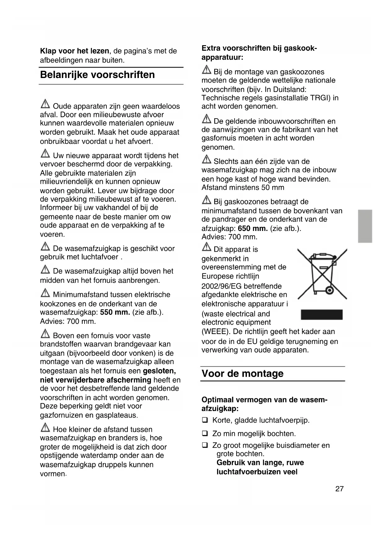 Extra voorschriften bij gaskook- apparatuur: Bij de montage van gaskoozones moeten de geldende wettelijke nationale voorschriften (bijv. In Duitsland: Technische regels gasinstallatie TRGI) in acht worden genomen. De geldende inbouwvoorschriften en de aanwijzingen van de fabrikant van het gasfornuis moeten in acht worden genomen. Slechts aan één zijde van de wasemafzuigkap mag zich na de inbouw een hoge kast of hoge wand bevinden. Afstand minstens 50 mm Bij gaskoozones betraagt de minimumafstand tussen de bovenkant van de pandrager en de onderkant van de afzuigkap: 650 mm. (zie afb.). Advies: 700 mm. Dit apparat is gekenmerkt in overeenstemming met de Europese richtlijn 2002/96/EG betreffende afgedankte elektrische en elektronische apparatuur i (waste electrical and electronic equipment (WEEE). De richtlijn geeft het kader aan voor de in de EU geldige terugneming en verwerking van oude apparaten. Voor de montage Optimaal vermogen van de wasem- afzuigkap: Korte, gladde luchtafvoerpijp. Zo min mogelijk bochten. Zo groot mogelijke buisdiameter en grote bochten. Gebruik van lange, ruwe luchtafvoerbuizen veel28