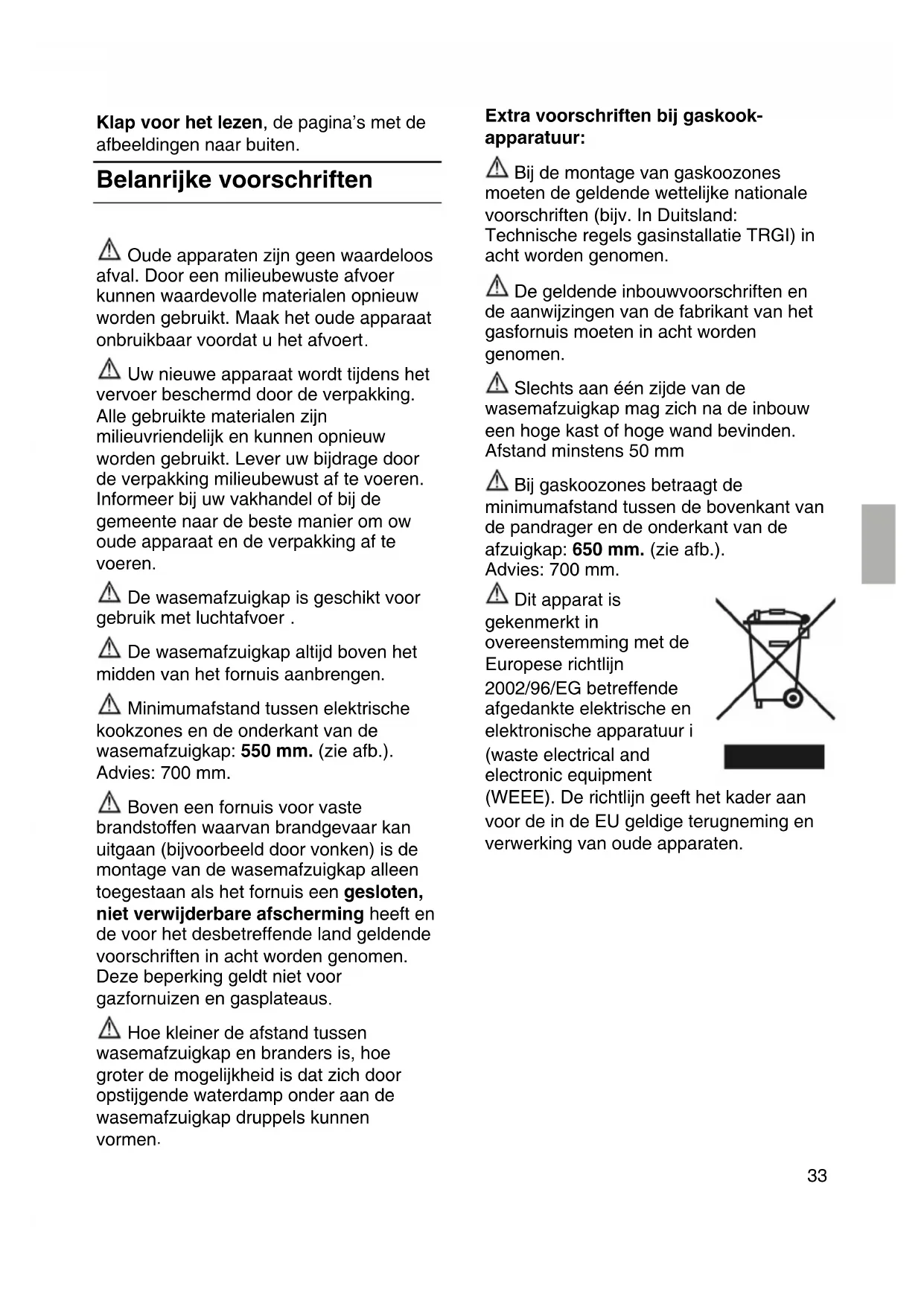 Extra voorschriften bij gaskook- apparatuur: Bij de montage van gaskoozones moeten de geldende wettelijke nationale voorschriften (bijv. In Duitsland: Technische regels gasinstallatie TRGI) in acht worden genomen. De geldende inbouwvoorschriften en de aanwijzingen van de fabrikant van het gasfornuis moeten in acht worden genomen. Slechts aan één zijde van de wasemafzuigkap mag zich na de inbouw een hoge kast of hoge wand bevinden. Afstand minstens 50 mm Bij gaskoozones betraagt de minimumafstand tussen de bovenkant van de pandrager en de onderkant van de afzuigkap: 650 mm. (zie afb.). Advies: 700 mm. Dit apparat is gekenmerkt in overeenstemming met de Europese richtlijn 2002/96/EG betreffende afgedankte elektrische en elektronische apparatuur i (waste electrical and electronic equipment (WEEE). De richtlijn geeft het kader aan voor de in de EU geldige terugneming en verwerking van oude apparaten.34