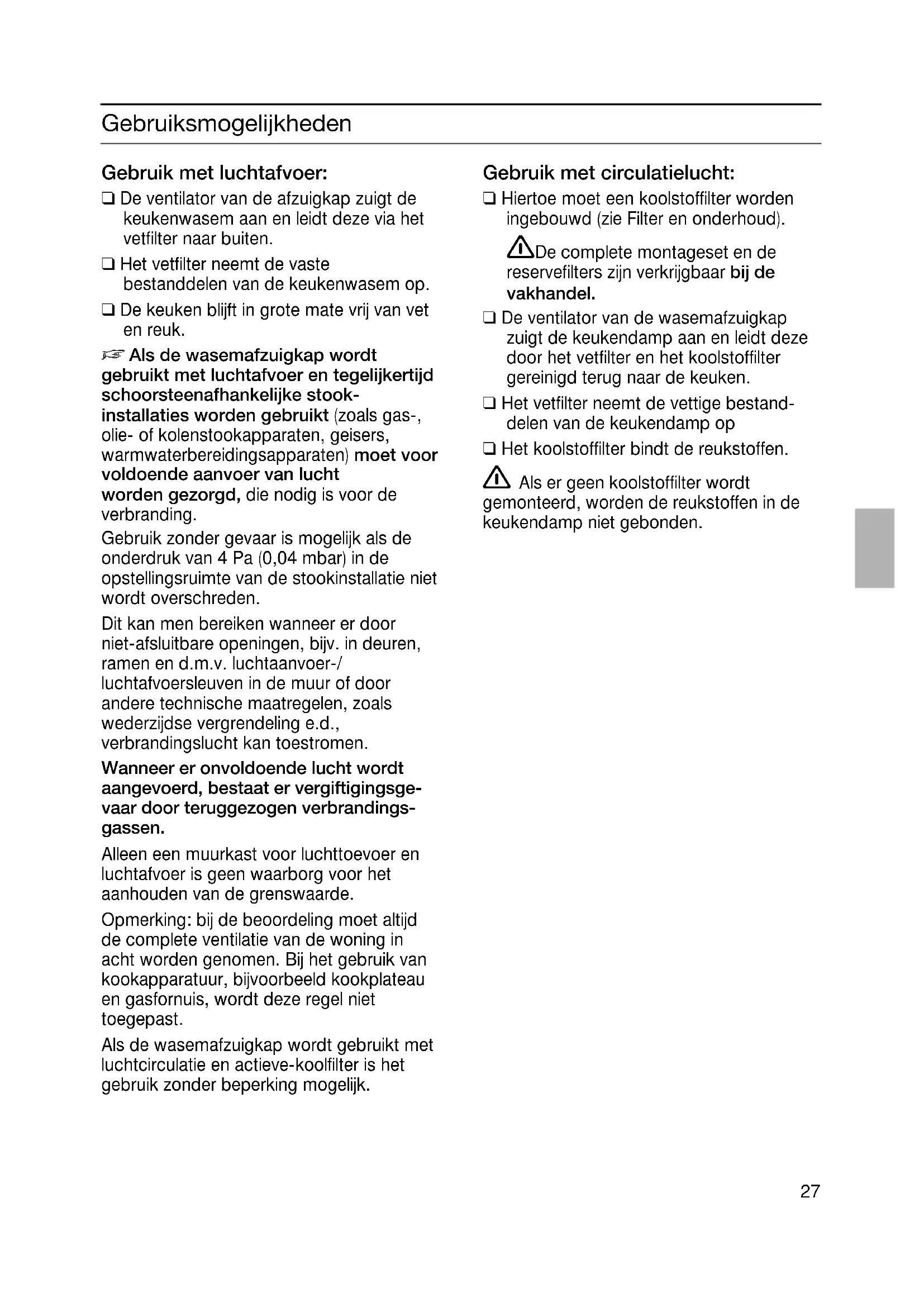 Als de wasemafzuigkap wordt gebruikt met luchtafvoer en tegelijkertijd schoorsteenafhankelijke stook- installaties worden gebruikt (zoals gas-, olie- of kolenstookapparaten, geisers, warmwaterbereidingsapparaten) moet voor voldoende aanvoer van lucht worden gezorgd, die nodig is voor de verbranding. Gebruik zonder gevaar is mogelijk als de onderdruk van 4 Pa (0,04 mbar) in de opstellingsruimte van de stookinstallatie niet wordt overschreden. Dit kan men bereiken wanneer er door niet-afsluitbare openingen, bijv. in deuren, ramen en d.m.v. luchtaanvoer-/ luchtafvoersleuven in de muur of door andere technische maatregelen, zoals wederzijdse vergrendeling e.d., verbrandingslucht kan toestromen. Wanneer er onvoldoende lucht wordt aangevoerd, bestaat er vergiftigingsge- vaar door teruggezogen verbrandings- gassen. Alleen een muurkast voor luchttoevoer en luchtafvoer is geen waarborg voor het aanhouden van de grenswaarde. Opmerking: bij de beoordeling moet altijd de complete ventilatie van de woning in acht worden genomen. Bij het gebruik van kookapparatuur, bijvoorbeeld kookplateau en gasfornuis, wordt deze regel niet toegepast. Als de wasemafzuigkap wordt gebruikt met luchtcirculatie en actieve-koolfilter is het gebruik zonder beperking mogelijk. Gebruiksmogelijkheden Gebruik met circulatielucht: ❑ Hiertoe moet een koolstoffilter worden ingebouwd (zie Filter en onderhoud). De complete montageset en de reservefilters zijn verkrijgbaar bij de vakhandel. ❑ De ventilator van de wasemafzuigkap zuigt de keukendamp aan en leidt deze door het vetfilter en het koolstoffilter gereinigd terug naar de keuken. ❑ Het vetfilter neemt de vettige bestand- delen van de keukendamp op ❑ Het koolstoffilter bindt de reukstoffen. Als er geen koolstoffilter wordt gemonteerd, worden de reukstoffen in de keukendamp niet gebonden.28 Vóór het eerste gebruik Belangrijke aanwijzingen: ❑ Deze gebruiksaanwijzing geldt voor verschillende uitvoeringen van het apparaat. Het is mogelijk dat er een aantal kenmerken worden beschreven die niet van toepassing zijn op uw apparaat. ❑ Deze afzuigkap voldoet aan de geldende veiligheidsvoorschriften. Reparaties mogen uitsluitend worden uitgevoerd door een vakman. Door ondeskundige reparaties kunnen aanzienlijke gevaren voor de gebruiker ontstaan. Gaskookplaten / gasfornuizen Gebruik niet alle gaskookzones tegelijk langdurig (max. 15 minuten) op de hoogste stand, anders bestaat er kans op brandwonden bij aanraking van de oppervlakken van de behuizing en gevaar van beschadiging van de afzuigkap. Bij gebruik van de afzuigkap boven een gaskookplaat waarvan gelijktijdig drie of meer gaskookzones worden gebruikt, moet de afzuigkap op de maximumstand worden gezet. ❑ Lees de gebruiksaanwijzing zorgvuldig voordat u het nieuwe apparaat gebruikt. Ze bevat belangrijke informatie voor uw veiligheid en voor het gebruik en het onderhoud van het apparaat. ❑ Bewaar de gebruiksaanwijzing en het montagevoorschrift zorgvuldig, eventueel voor een volgende bezitter van het apparaat. ❑ Dit apparaat is gekenmerkt in overeenstemmig met de Europese richtlijn 2002/96/EG betreffende afgedankte elektrische en elektronische apparatuur (waste electrical and electronic equipment – WEEE). De richtlijn geeft het kader aan voor de in de EU geldige terugneming en verwerking van oude apparaten.