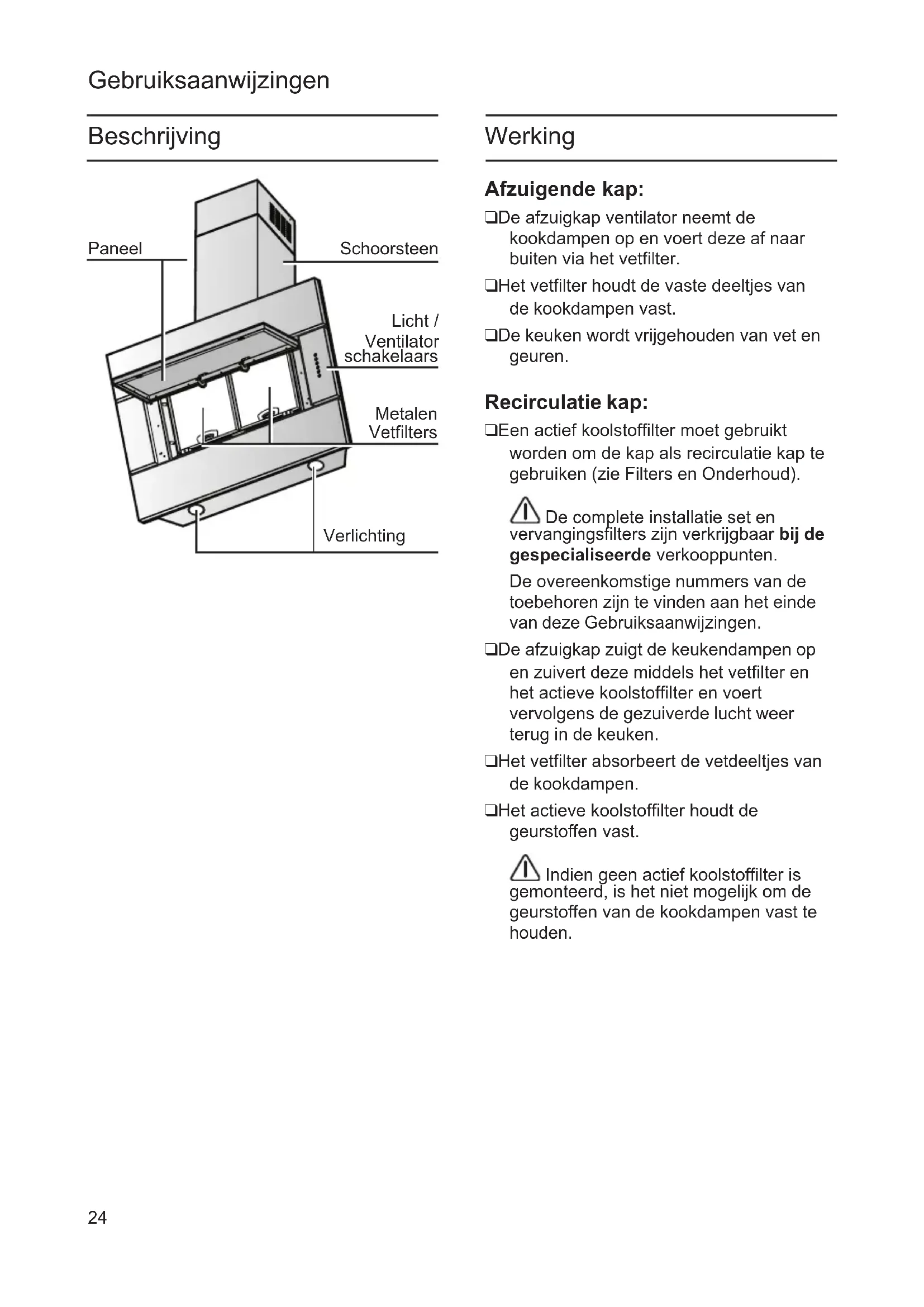 Selectieknop snelheid (zuigkracht) 3: druk 1 maal om de snelheid (zuigkracht) te selecteren, druk nogmaals en houd ingedrukt om de werkingsduur van 10 minuten in te stellen (knipperende knop) daarna gaat de kap uit. Selectieknop voor de intensieve snelheid (zuigkracht) met timer: druk op deze knop om de intensieve snelheid (zuigkracht) voor een tijdsduur van 5 minuten te selecteren (knipperende knop), na afloop gaat de zuigmotor uit of keert terug op de eerder ingestelde snelheid (zuigkracht).27 Filters en onderhoud Attentie! Koppel, voor ieder onderhoud, eerst de wasemkap van het elektriciteitsnet af door de stekker weg te trekken of door de hoofdschakelaar van de woning uit te schakelen. Onderhoud van het paneel Demontage : Verwijder met kracht (ONDERZIJDE) en draai naar boven toe. Draai met een muntje de knopjes los die het paneel aan de kap bevestigen en maak het paneel los uit de bovenste bevestigingspunten. Reiniging: het paneel moet met dezelfde regelmaat als het vetfilter gereinigd worden. Reinig met de hand en met reinigingsmiddelen, maar gebruik geen schuurmiddelen. Niet in de vaatwasmachine reinigen. Gebruik, om het achtergebleven water af te voeren, de openingen in de buurt van de randen aan de achterzijde. GEBRUIK GEEN ALCOHOL! Montage : Handel in de tegenovergestelde volgorde als voor de demontage. Draai de bevestigingsknopjes, met een muntje, goed vast. Attentie! controleer altijd of het paneel goed op zijn plaats vastzit. Vetfilters: Metalen filters worden gebruikt om, tijdens het koken, de vetdeeltjes van de kookdampen vast te houden. De filter matjes zijn van niet brandbaar metaal. Opgelet: Als het filter teveel met vet verzadigd raakt bestaat niet alleen het gevaar dat het in brand raakt maar ook dat de doeltreffendheid van de afzuigkap gereduceerd wordt. Belangrijk: Het reinigen van de metalen vetfilters op regelmatige tijden reduceert de mogelijkheid dat ze in brand raken als gevolg van een hitteverzameling, zoals er bij het frituren of roosteren gebeurt. Reiniging van de metalen vetfilters: ❑ Moet eenmaal per maand worden gereinigd (of als de aanwijzer verzadigde filters – indien aanwezig op het model in Uw bezit – deze noodzaak aangeeft). ❑ De filters kunnen in een vaatwasmachine gereinigd worden. Het is mogelijk dat het vetfilter iets ontkleurt. ❑ Het filter moet los geplaatst worden en NIET in de vaatwasmachine vastgezet worden. Belangrijk: Metalen filters die met vet verzadigd zijn moeten niet samen met de andere voorwerpen gereinigd worden. ❑ Als de filters met de hand gereinigd worden, deze eerst in een hete zeepoplossing laten weken. Vervolgens de filters schoon borstelen, dan grondig afspoelen en het water laten drogen.28 Actief koolstoffilter: Om geuren te neutraliseren in de uitvoering als recirculatie kap. Opgelet: As het filter teveel met vet verzadigd raakt neemt het gevaar voor brand toe en de werking van de afzuigkap wordt gereduceerd. Einbauen:
