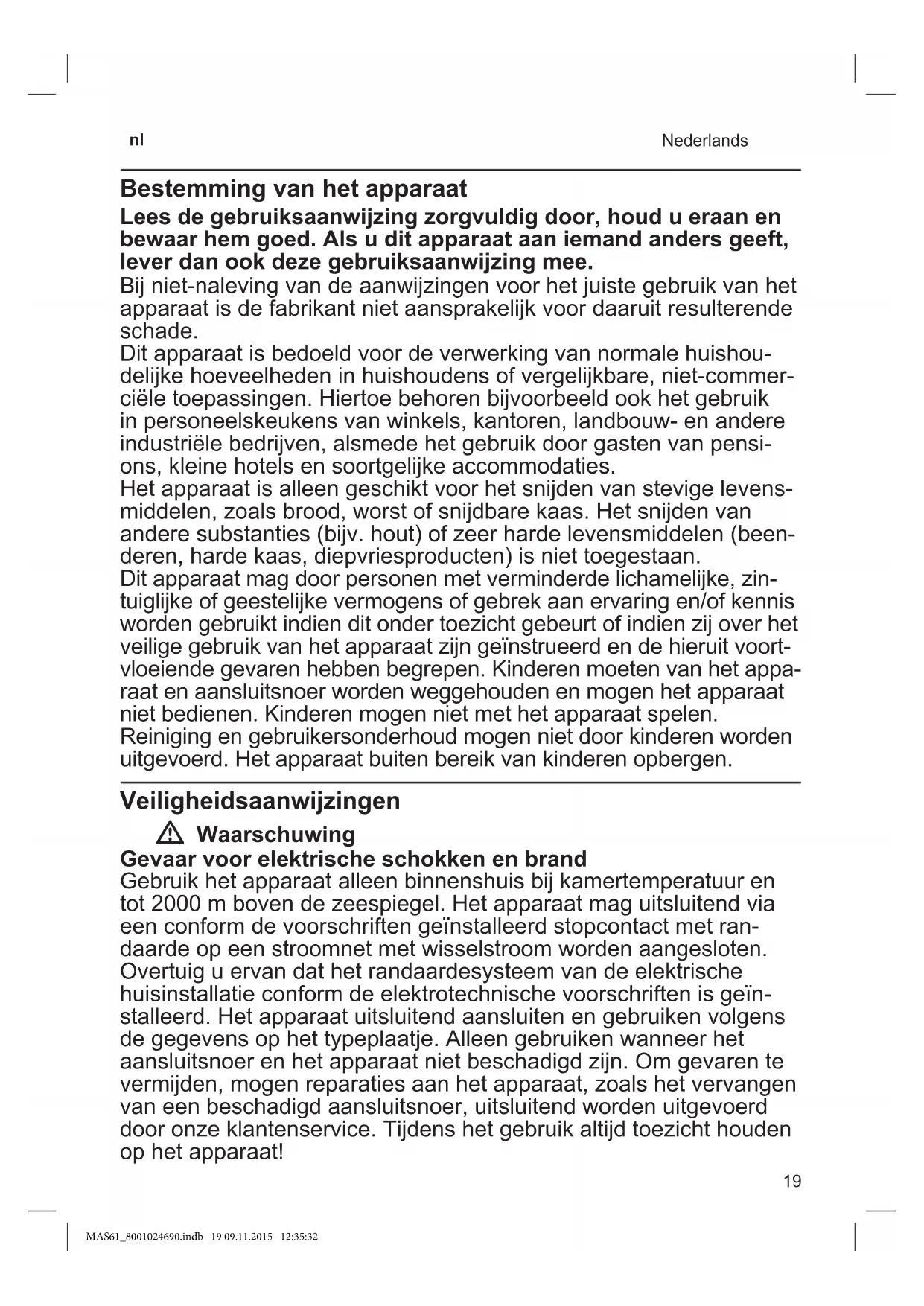- Nederlands Bestemming van het apparaat Lees de gebruiksaanwijzing zorgvuldig door, houd u eraan en bewaar hem goed. Als u dit apparaat aan iemand anders geeft, lever dan ook deze gebruiksaanwijzing mee. Bijniet-nalevingvandeaanwijzingenvoorhetjuistegebruikvanhet apparaatisdefabrikantnietaansprakelijkvoordaaruitresulterende schade. Ditapparaatisbedoeldvoordeverwerkingvannormalehuishou- delijkehoeveelhedeninhuishoudensofvergelijkbare,niet-commer- ciëletoepassingen.Hiertoebehorenbijvoorbeeldookhetgebruik inpersoneelskeukensvanwinkels,kantoren,landbouw-enandere industriëlebedrijven,alsmedehetgebruikdoorgastenvanpensi- ons,kleinehotelsensoortgelijkeaccommodaties. Hetapparaatisalleengeschiktvoorhetsnijdenvanstevigelevens- middelen,zoalsbrood,worstofsnijdbarekaas.Hetsnijdenvan anderesubstanties(bijv.hout)ofzeerhardelevensmiddelen(been- deren,hardekaas,diepvriesproducten)isniettoegestaan. Ditapparaatmagdoorpersonenmetverminderdelichamelijke,zin- tuiglijkeofgeestelijkevermogensofgebrekaanervaringen/ofkennis wordengebruiktindienditondertoezichtgebeurtofindienzijoverhet veiligegebruikvanhetapparaatzijngeïnstrueerdendehieruitvoort- vloeiendegevarenhebbenbegrepen.Kinderenmoetenvanhetappa- raatenaansluitsnoerwordenweggehoudenenmogenhetapparaat nietbedienen.Kinderenmogennietmethetapparaatspelen. Reinigingengebruikersonderhoudmogennietdoorkinderenworden uitgevoerd.Hetapparaatbuitenbereikvankinderenopbergen. Veiligheidsaanwijzingen W Waarschuwing Gevaar voor elektrische schokken en brand Gebruikhetapparaatalleenbinnenshuisbijkamertemperatuuren tot2000mbovendezeespiegel.Hetapparaatmaguitsluitendvia eenconformdevoorschriftengeïnstalleerdstopcontactmetran- daardeopeenstroomnetmetwisselstroomwordenaangesloten. Overtuiguervandathetrandaardesysteemvandeelektrische huisinstallatieconformdeelektrotechnischevoorschriftenisgeïn- stalleerd.Hetapparaatuitsluitendaansluitenengebruikenvolgens degegevensophettypeplaatje.Alleengebruikenwanneerhet aansluitsnoerenhetapparaatnietbeschadigdzijn.Omgevarente vermijden,mogenreparatiesaanhetapparaat,zoalshetvervangen vaneenbeschadigdaansluitsnoer,uitsluitendwordenuitgevoerd dooronzeklantenservice.Tijdenshetgebruikaltijdtoezichthouden ophetapparaat! MAS61_8001024690.indb 19 09.11.2015 12:35:3220 nl Nederlands Inhoud Hartelijk gefeliciteerd met de aankoop van uw nieuwe Bosch-apparaat. Meer informatie over onze producten vindt u op onze internetsite. Bestemmingvanhetapparaat p. 19