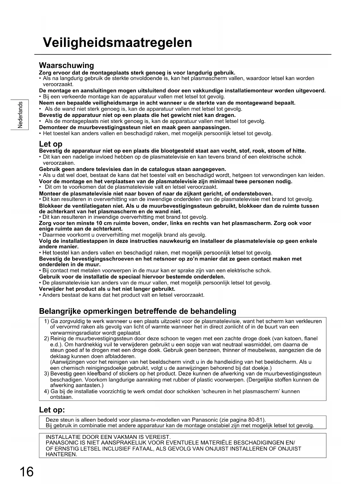- Als na langdurig gebruik de sterkte onvoldoende is, kan het plasmascherm vallen, waardoor letsel kan worden veroorzaakt. De montage en aansluitingen mogen uitsluitend door een vakkundige installatiemonteur worden uitgevoerd.