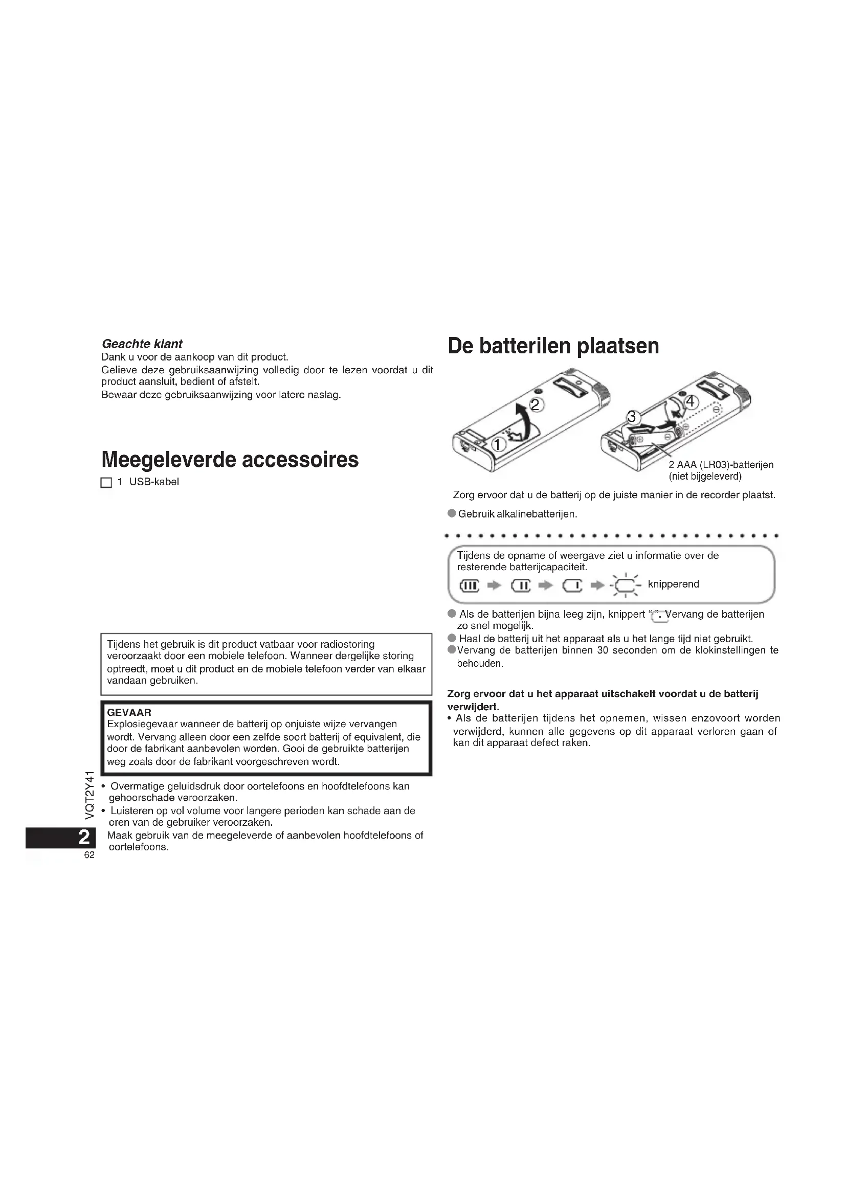 Explosiegevaar wanner de batterij op onjuiste wijze verrangen wordt. Vervang alleen door een zelfde soort batterij of equivalent, die door de fabrikant aanbevolen worden. Gooi de gebrukke batterijen weg zoals door de fabrikant voorgeschreven worden.