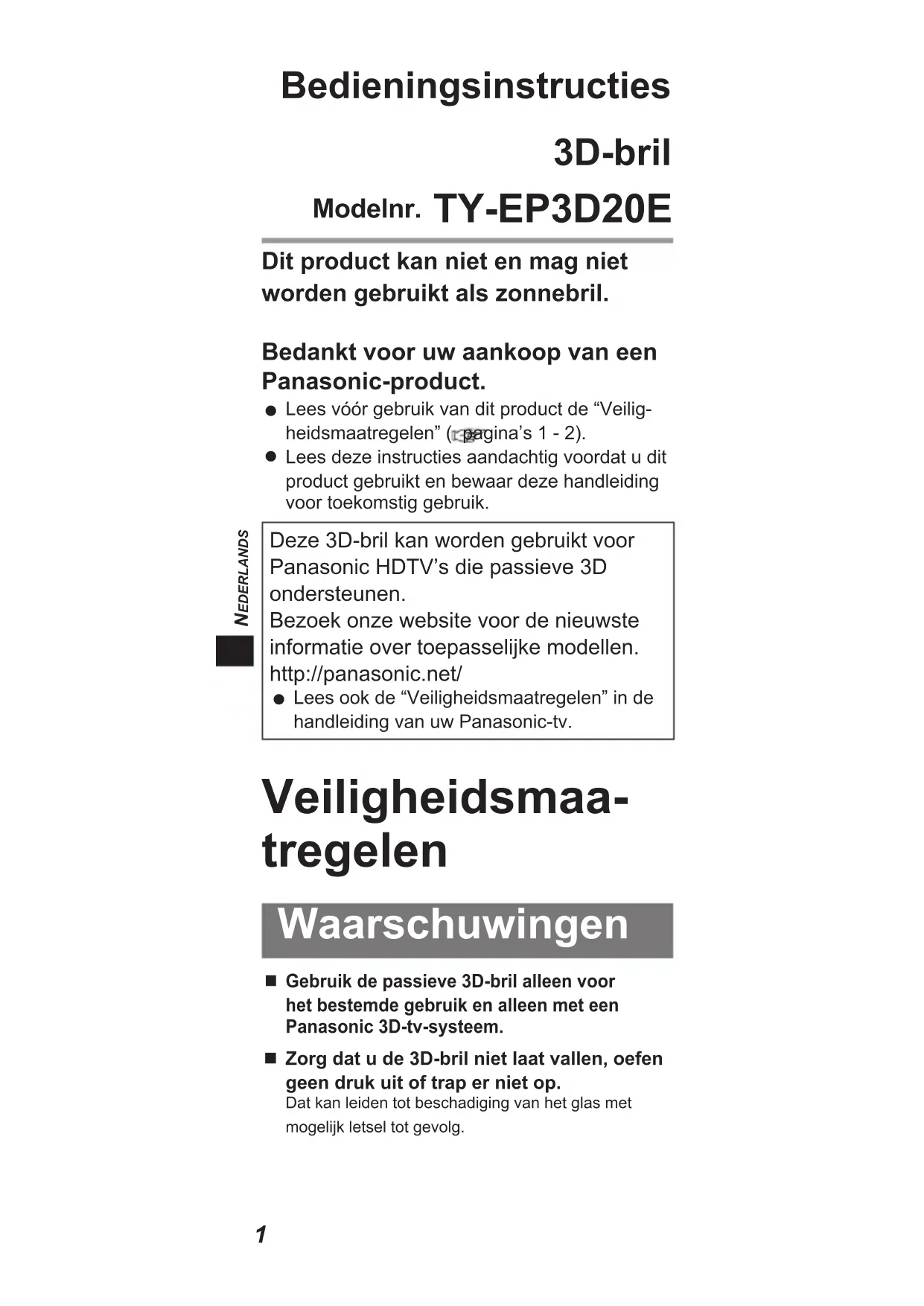EDERLANDS Bedieningsinstructies 3D-bril Modelnr. TY-EP3D20E Dit product kan niet en mag niet worden gebruikt als zonnebril.Bedankt voor uw aankoop van een Panasonic-product.Lees vóór gebruik van dit product de “Veilig- heidsmaatregelen” ( pagina’s 1 - 2).Lees deze instructies aandachtig voordat u dit product gebruikt en bewaar deze handleiding voor toekomstig gebruik.Deze 3D-bril kan worden gebruikt voor Panasonic HDTV’s die passieve 3D ondersteunen.Bezoek onze website voor de nieuwste informatie over toepasselijke modellen.http://panasonic.net/Lees ook de “Veiligheidsmaatregelen” in de handleiding van uw Panasonic-tv. Veiligheidsmaa- tregelen Waarschuwingen Gebruik de passieve 3D-bril alleen voor het bestemde gebruik en alleen met een Panasonic 3D-tv-systeem.Zorg dat u de 3D-bril niet laat vallen, oefen geen druk uit of trap er niet op.Dat kan leiden tot beschadiging van het glas met mogelijk letsel tot gevolg.2