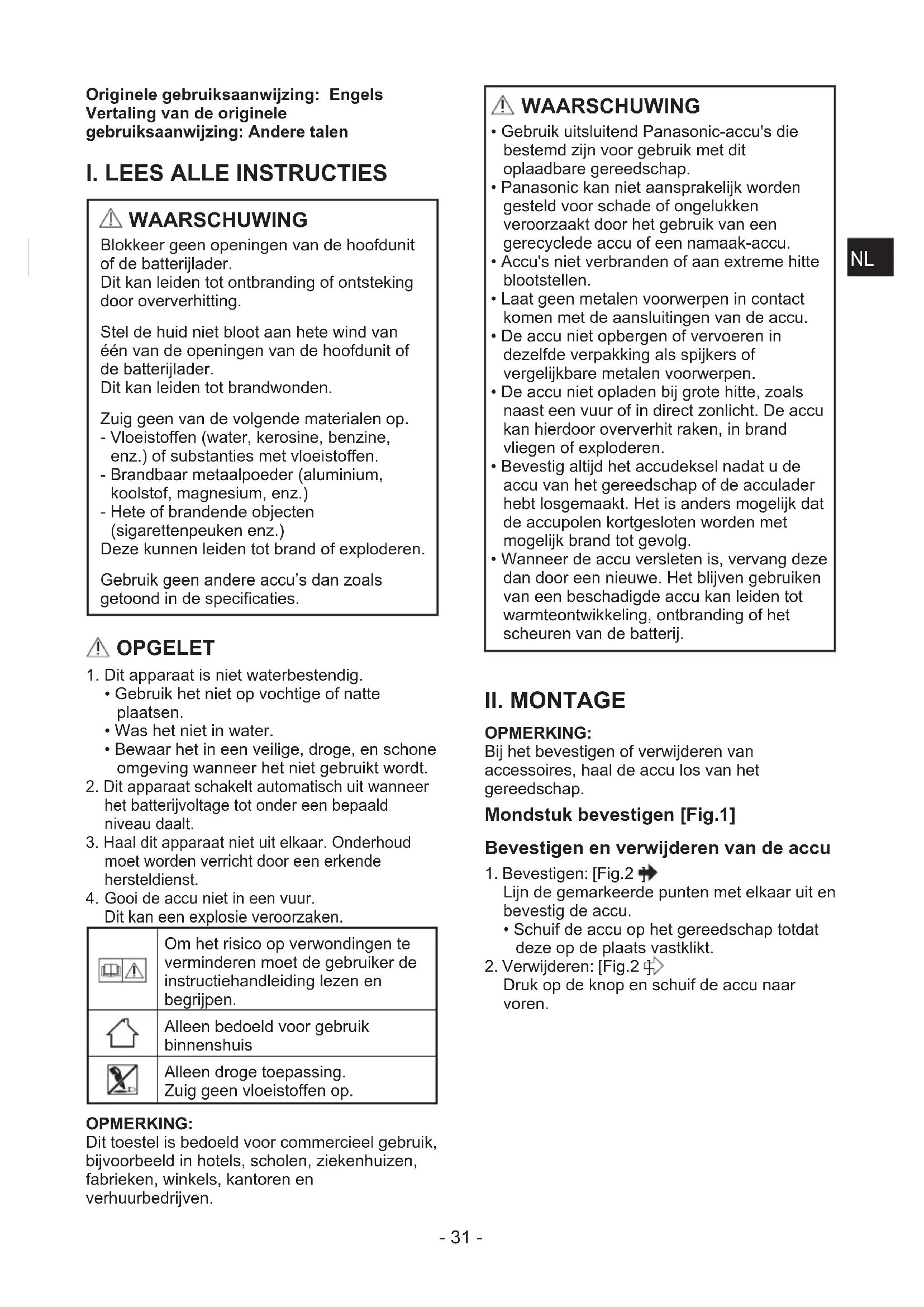 - Gebruik uitsluitend Panasonic-accu's die bestemd zijn voor gebruik met dit oplaadbare gereedschap.
