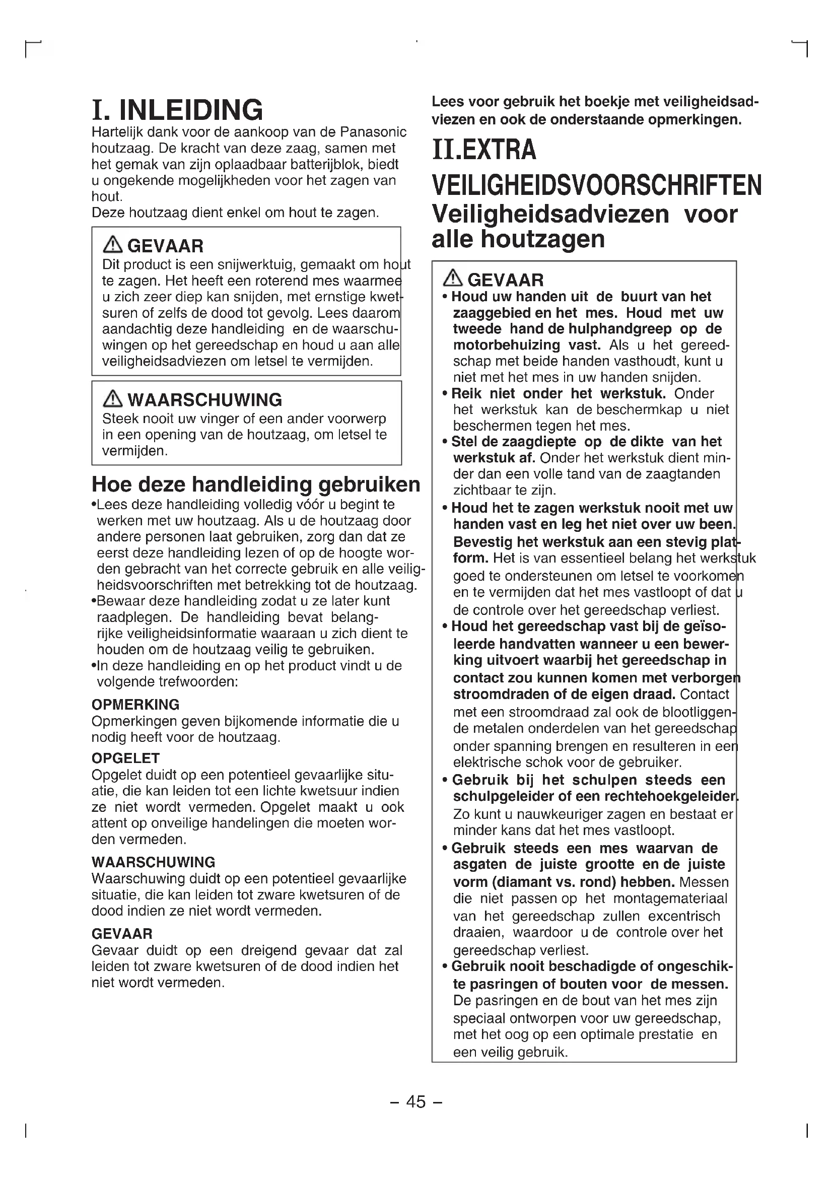 Hartelijk dank voor de aankoop van de Panasonic houtzaag. De kracht van deze zaag, samen met het gemak van zijn oplaadbaar batterijblok, biedt u ongekende mogelijkheden voor het zagen van hout.Deze houtzaag dient enkel om hout te zagen. GEVAAR Dit product is een snijwerktuig, gemaakt om hout te zagen. Het heeft een roterend mes waarmee u zich zeer diep kan snijden, met ernstige kwet-suren of zelfs de dood tot gevolg. Lees daarom aandachtig deze handleiding en de waarschu-wingen op het gereedschap en houd u aan alle veiligheidsadviezen om letsel te vermijden. WAARSCHUWING Steek nooit uw vinger of een ander voorwerp in een opening van de houtzaag, om letsel te vermijden. Hoe deze handleiding gebruiken
