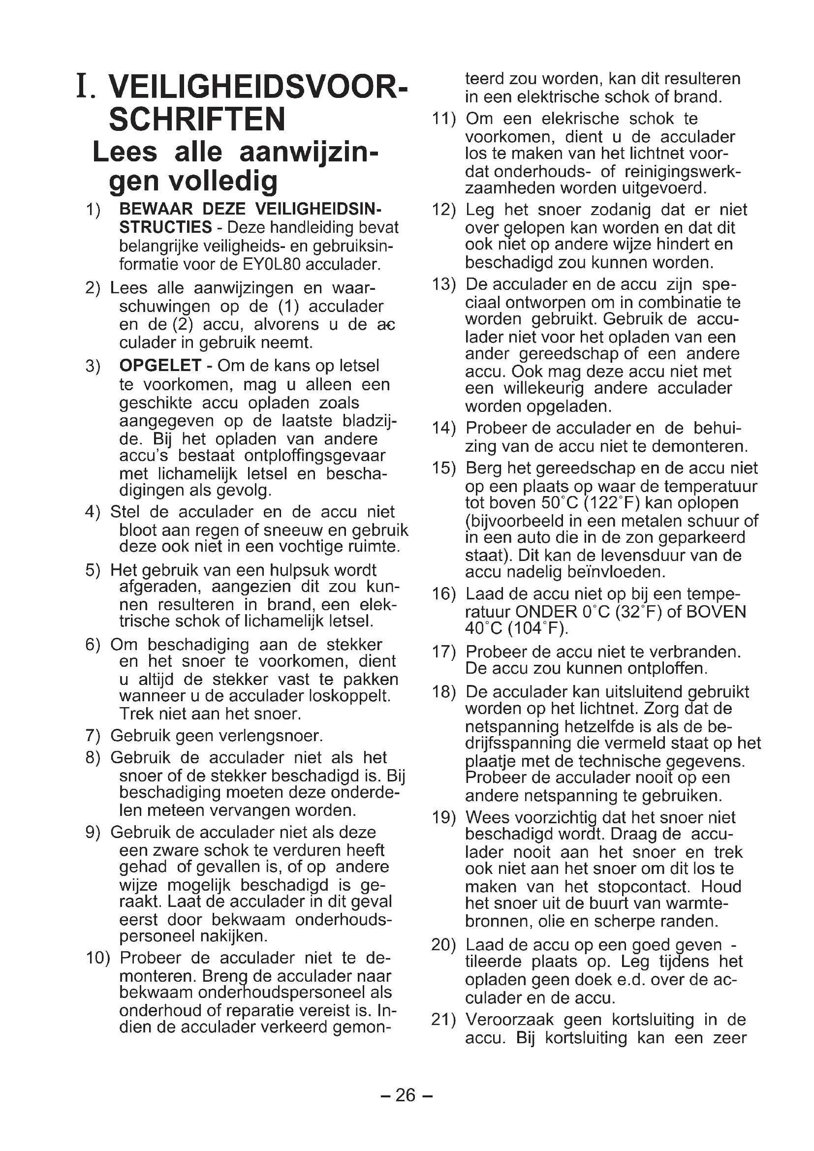 [Informatie over de verwijdering in andere landen buiten de Euro- pese Unie] Deze symbolen zijn enkel geldig in de Europese Unie. Indien u wenst deze producten te verwijderen, neem dan contact op met uw plaatselijke autoriteiten of dealer, en vraag informatie over de correcte wijze om deze producten te verwijderen. Opmerking over het batterijensymbool (beneden twee voorbeelden): Dit symbool kan gebruikt worden in verbinding met een chemisch symbool. In dat geval wordt de eis, vastgelegd door de Richtlijn voor de betrokken chemische producten vervuld. III . TECHNISCHE GEGEVENS Model EY0L80Toelaatbaar vermogen Ziehetspecicatieplaatjeopdeonderkantvandeacculader.Gewicht 0,95 k (2,1 lbs) [Li-ion accu] LaadtijdSpanning14,4 V gelijkstroom(3,6 V × 4 cellen)21,6 V gelijkstroom(3,6 V × 6 cellen)28,8 V gelijkstroom(3,6 V × 8 cellen) 3 Ah EY9L40Bruikbaar: 35 min.Vol: 50 min.EY9L60Bruikbaar: 45 min.Vol: 60 min.EY9L80Bruikbaar: 55 min.Vol: 70 min. [Ni-MH/Ni-Cd accu] Laadtijd7,2 V9,6 V 12 V 15,6 V 18 V 24 V1,2 AhEY9065EY9066EY9080EY9086EY900120 min.1,7 AhEY9180EY9182EY9101EY910325 min. 2 Ah EY9168 EY9188EY9106EY9107EY9108EY9136EY9116EY911730 min. 60 min. 3 Ah EY9200 EY9230 EY921045 min. 90 min.3,5 AhEY9201 EY9231 EY925155 min. 65 min. OPMERKING: In deze tabel zijn mogelijk modellen opgenomen die niet in de han- del verkrijgbaar zijn. Zie de meest recente algemene catalogus.-