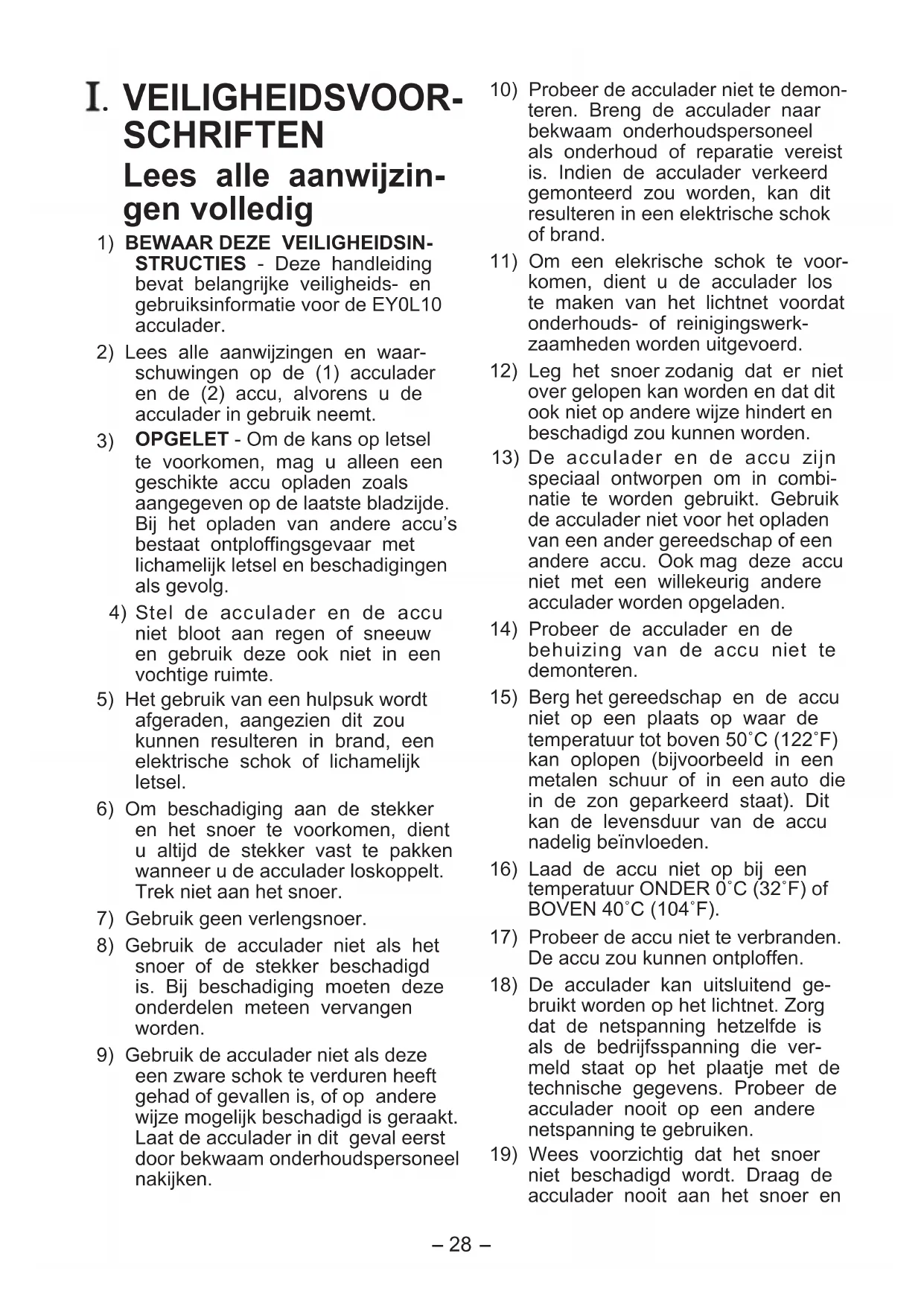 OPGELET - Om de kans op letsel te voorkomen, mag u alleen een geschikte accu opladen zoals aangegeven op de laatste bladzijde. Bij het opladen van andere accu’s bestaat ontploffingsgevaar met lichamelijk letsel en beschadigingen als gevolg.