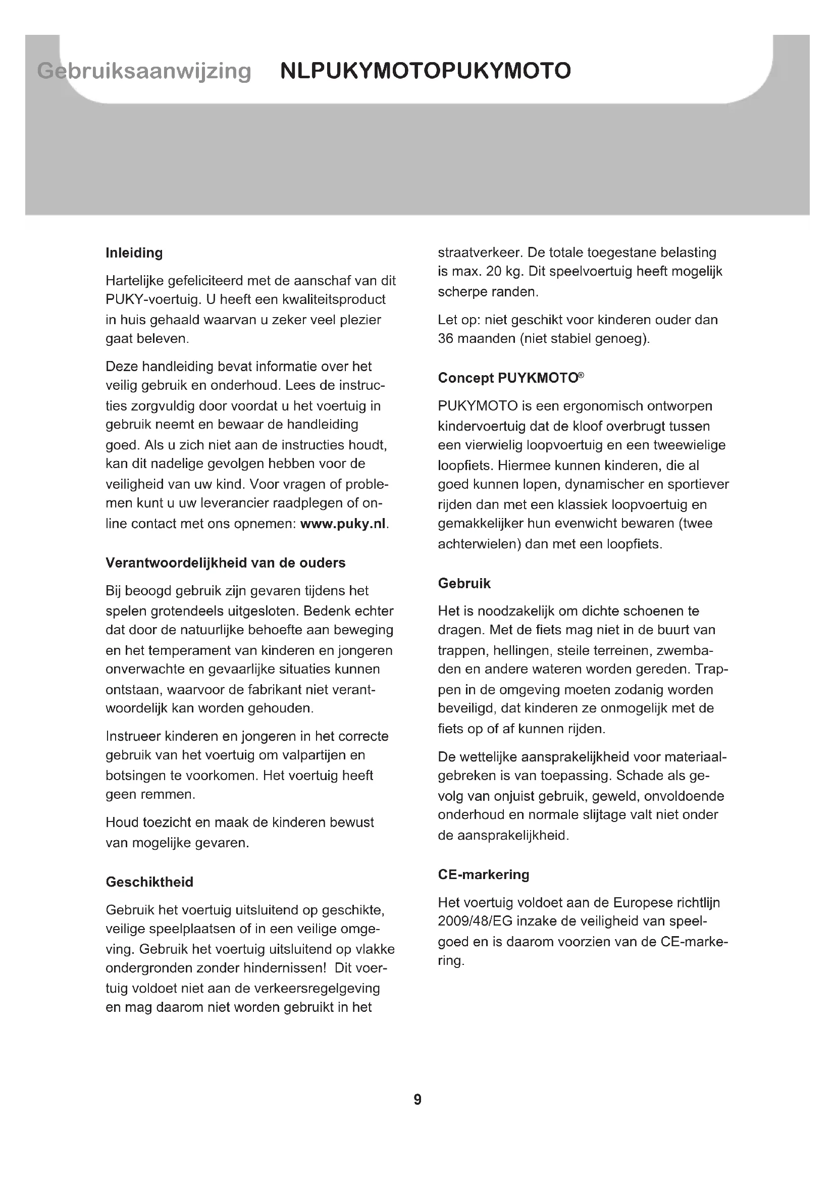 Deze handleiding bevat informatatie over het veilig gebruik en onderhoud. Lees de instructies zorgvuldig door voordat u het voertuig in gebruik neemt en bewaar de handleiding goed. Als u zich Niet aan de instructies houdt, kan dit nadelige gevolgen hebben voor de veilighheid van uw kind. Voor vragen of problemen kunt u uw leverancier raadplegen of online contact met ons opnemen: www.puky.nl.