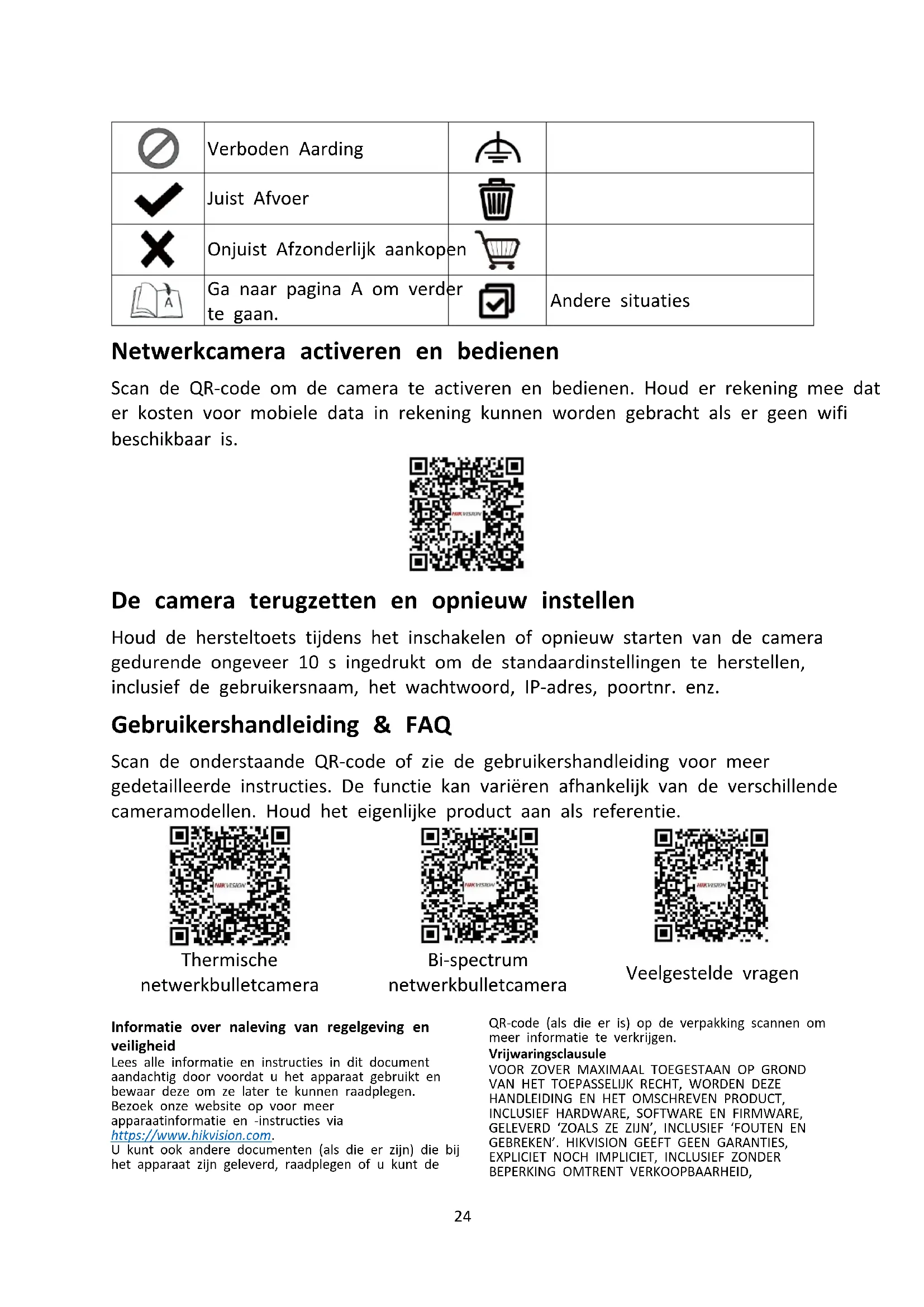 niet is vereist. Waarschuwing Micro-SD-kaart24 Verboden Aarding Juist Afvoer Onjuist Afzonderlijk aankopen Ga naar pagina A om verder te gaan. Andere situaties Netwerkcamera activeren en bedienen Scan de QR-code om de camera te activeren en bedienen. Houd er rekening mee dat er kosten voor mobiele data in rekening kunnen worden gebracht als er geen wifi beschikbaar is. De camera terugzetten en opnieuw instellen Houd de hersteltoets tijdens het inschakelen of opnieuw starten van de camera gedurende ongeveer 10 s ingedrukt om de standaardinstellingen te herstellen, inclusief de gebruikersnaam, het wachtwoord, IP-adres, poortnr. enz. Gebruikershandleiding & FAQ Scan de onderstaande QR-code of zie de gebruikershandleiding voor meer gedetailleerde instructies. De functie kan variëren afhankelijk van de verschillende cameramodellen. Houd het eigenlijke product aan als referentie. Thermische netwerkbulletcamera Bi-spectrum netwerkbulletcamera Veelgestelde vragen Informatie over naleving van regelgeving en veiligheid Lees alle informatie en instructies in dit document aandachtig door voordat u het apparaat gebruikt en bewaar deze om ze later te kunnen raadplegen. Bezoek onze website op voor meer apparaatinformatie en -instructies via https://www.hikvision.com. U kunt ook andere documenten (als die er zijn) die bij het apparaat zijn geleverd, raadplegen of u kunt de QR-code (als die er is) op de verpakking scannen om meer informatie te verkrijgen. Vrijwaringsclausule
