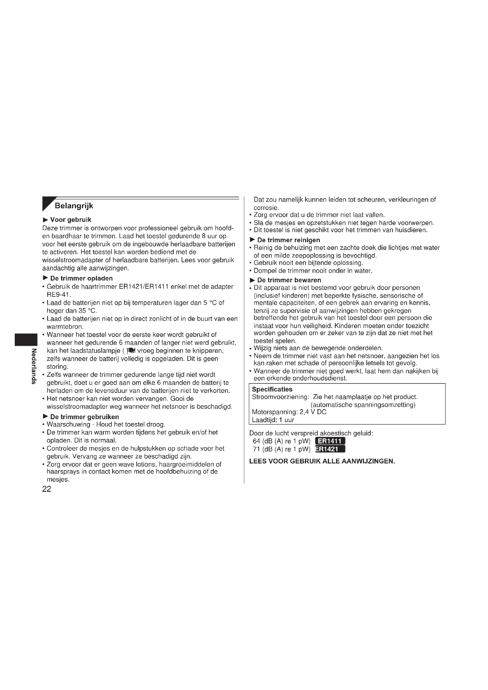 Dat zou namelijk kunnen leiden tot scheuren, verkleuringen of corrosie. Zorg ervoor dat u de trimmer niet laat vallen. Sla de mesjes en opzetstukken niet tegen harde voorwerpen. Dit toestel is niet geschikt voor het trimmen van huisdieren. De trimmer reinigen Reinig de behuizing met een zachte doek die lichtjes met water of een milde zeepoplossing is bevochtigd. Gebruik nooit een bijtende oplossing. Dompel de trimmer nooit onder in water. De trimmer bewaren Dit apparaat is niet bestemd voor gebruik door personen (inclusief kinderen) met beperkte fysische, sensorische of mentale capaciteiten, of een gebrek aan ervaring en kennis, tenzij ze supervisie of aanwijzingen hebben gekregen betreffende het gebruik van het toestel door een persoon die instaat voor hun veiligheid. Kinderen moeten onder toezicht worden gehouden om er zeker van te zijn dat ze niet met het toestel spelen. Wijzig niets aan de bewegende onderdelen. Neem de trimmer niet vast aan het netsnoer, aangezien het los kan raken met schade of persoonlijke letsels tot gevolg. Wanneer de trimmer niet goed werkt, laat hem dan nakijken bij een erkende onderhoudsdienst. Specicaties Stroomvoorziening: Zie het naamplaatje op het product. (automatische spanningsomzetting) Motorspanning: 2,4 V DC Laadtijd: 1 uur Door de lucht verspreid akoestisch geluid: 64 (dB (A) re 1 pW) ER1411 71 (dB (A) re 1 pW) ER1421 LEES VOOR GEBRUIK ALLE AANWIJZINGEN.
