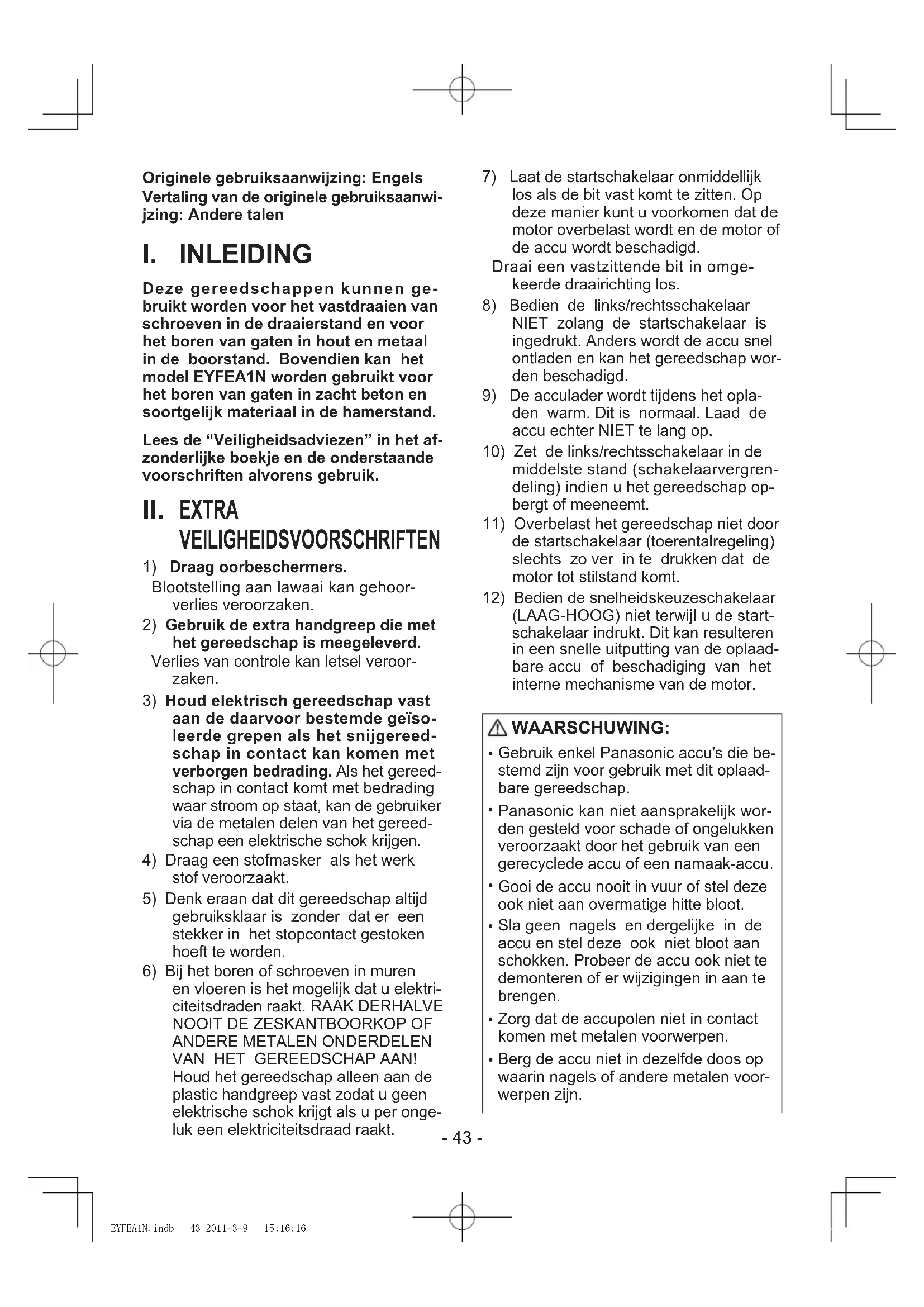 (rpm) Maximaal aandraaimoment Laag 6,0 N·m (61 kgf-cm, 53,24 in-lbs) Hoog 2,0 N·m (20 kgf-cm, 17,75 in-lbs) Koppelingsdraaimoment Ong. 0,3 N·m (3 kgf-cm, 2,6 in-lbs) – 4,0 N·m (41 kgf-cm, 35,6 in-lbs) Totale lengte 145 mm (5-7/10") Gewicht (met accu) 0,63 kg (1,39 lbs) EYFEA1N.indb 51 2011-3-9 15:16:18- 52 - ACCU Model EY9L20 Soort accu Li-ion Accuspanning 7,2 V gelijkstroom (3,6 V × 2 cellen) Laadtijd Bruikbaar: 35 min. Vol: 60 min. OPMERKING: In deze tabel zijn mogelijk modellen opgenomen die niet in de handel ver- krijgbaar zijn. Zie de meest recente algemene catalogus. Zie de ingesloten garantiekaart voor de naam en het adres van de dealer. ACCULADER Model EY0L20 Gegevens Zie het specicatieplaatje op de onderkant van de acculader. Gewicht 0,43 kg (0,951 lbs) OPMERKING: In deze tabel zijn mogelijk modellen opgenomen die niet in de handel ver- krijgbaar zijn. Zie de meest recente algemene catalogus. OPMERKING: Zie de ingesloten garantiekaart voor de naam en het adres van de dealer. EYFEA1N.indb 52 2011-3-9 15:16:18- 53 - Manual de instrucciones original: Inglés Traducción del manual de instruc- ciones original: Otros idiomas