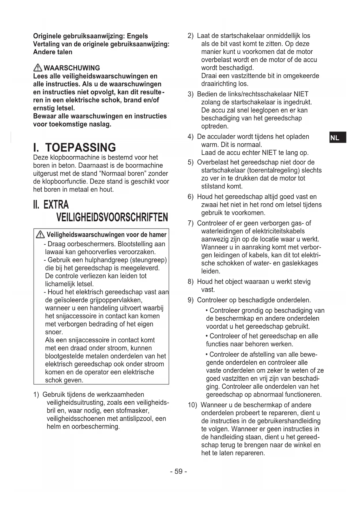 VEILIGHEIDSVOORSCHRIFTEN Veiligheidswaarschuwingen voor de hamer - Draag oorbeschermers. Blootstelling aan lawaai kan gehoorverlies veroorzaken. - Gebruik een hulphandgreep (steungreep) die bij het gereedschap is meegeleverd. De controle verliezen kan leiden tot lichamelijk letsel. - Houd het elektrisch gereedschap vast aan de geïsoleerde grijpoppervlakken, wanneer u een handeling uitvoert waarbij het snijaccessoire in contact kan komen met verborgen bedrading of het eigen snoer. Als een snijaccessoire in contact komt met een draad onder stroom, kunnen blootgestelde metalen onderdelen van het elektrisch gereedschap ook onder stroom komen en de operator een elektrische schok geven.