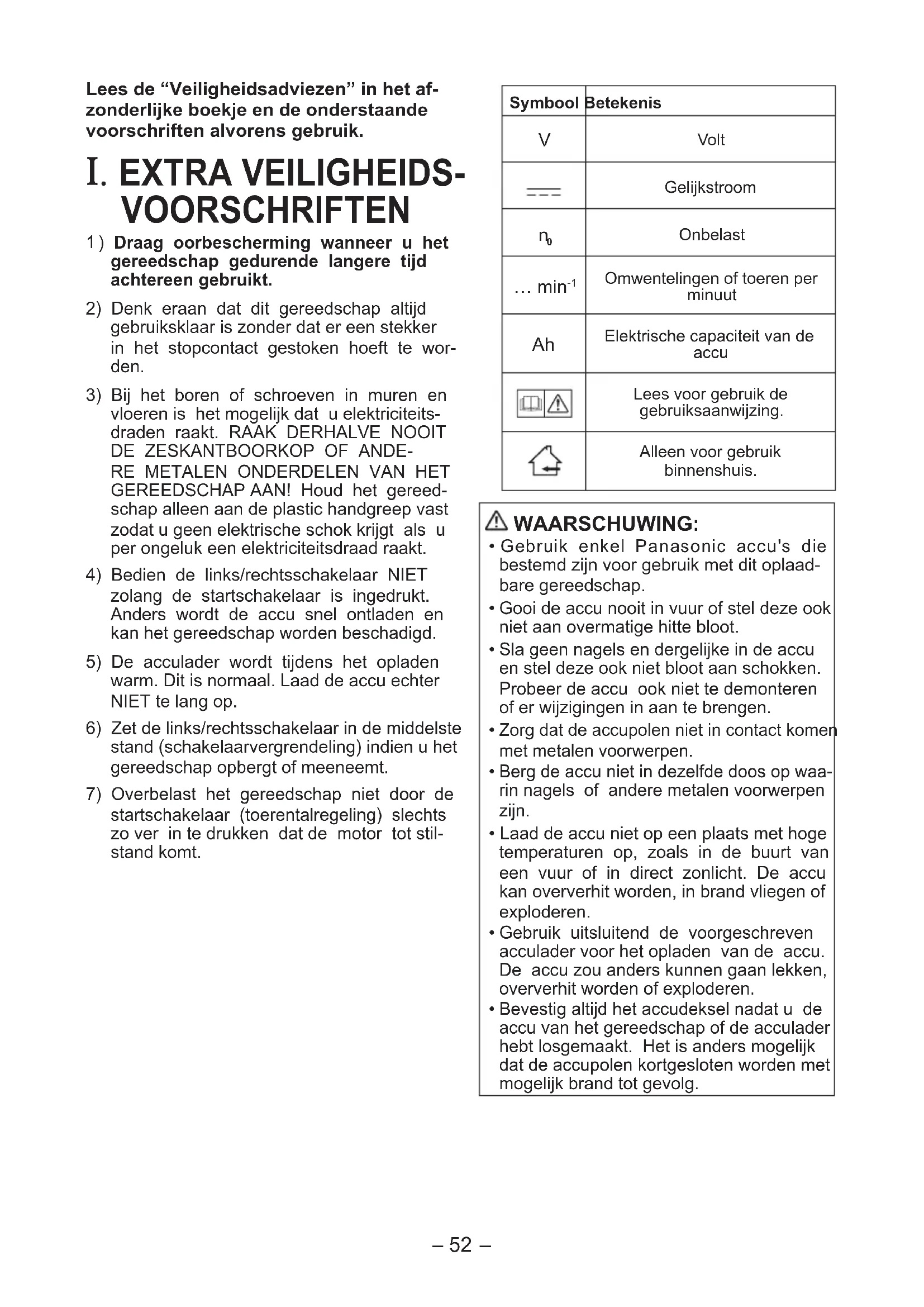 - Gebruik enkel Panasonic accu's die bestemd zijn voor gebruik met dit oplaad-bare gereedschap. Gooi de accu nooit in vuur of stel deze ook niet aan overmatige hitte bloot. Sla geen nagels en dergelijke in de accu en stel deze ook niet bloot aan schokken. Probeer de accu ook niet te demonteren of er wijzigingen in aan te brengen. Zorg dat de accupolen niet in contact komen met metalen voorwerpen. Berg de accu niet in dezelfde doos op waa-rin nagels of andere metalen voorwerpen zijn.• Laad de accu niet op een plaats met hoge temperaturen op, zoals in de buurt van een vuur of in direct zonlicht. De accu kan oververhit worden, in brand vliegen of exploderen. Gebruik uitsluitend de voorgeschreven acculader voor het opladen van de accu. De accu zou anders kunnen gaan lekken, oververhit worden of exploderen. Bevestig altijd het accudeksel nadat u de accu van het gereedschap of de acculader hebt losgemaakt. Het is anders mogelijk dat de accupolen kortgesloten worden met mogelijk brand tot gevolg.-