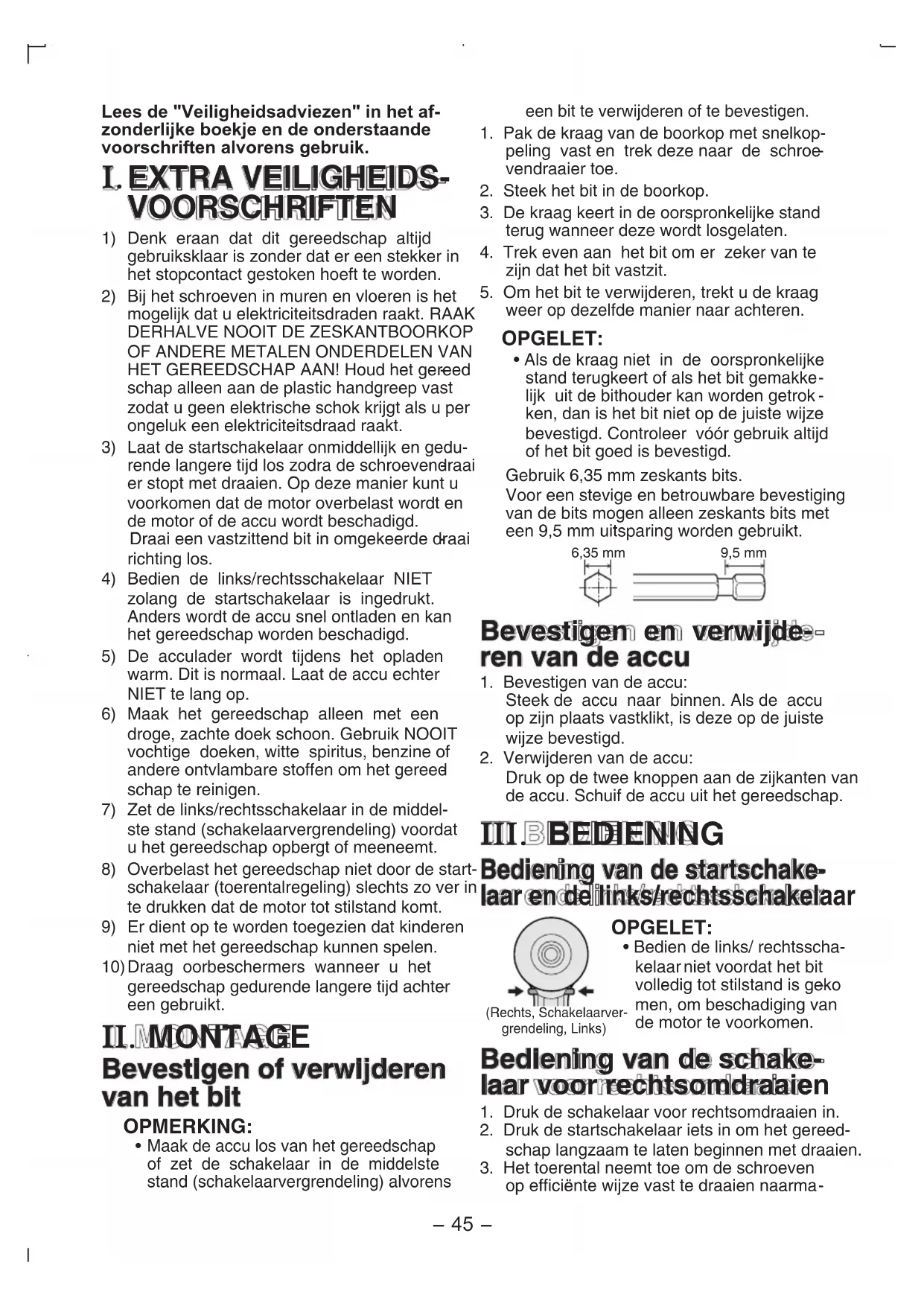 Bedien de links/rechtsschakelaarniet voordat het bit volledig tot stilstand is gekomen,om Beschadiging van de motor te voorkomen.