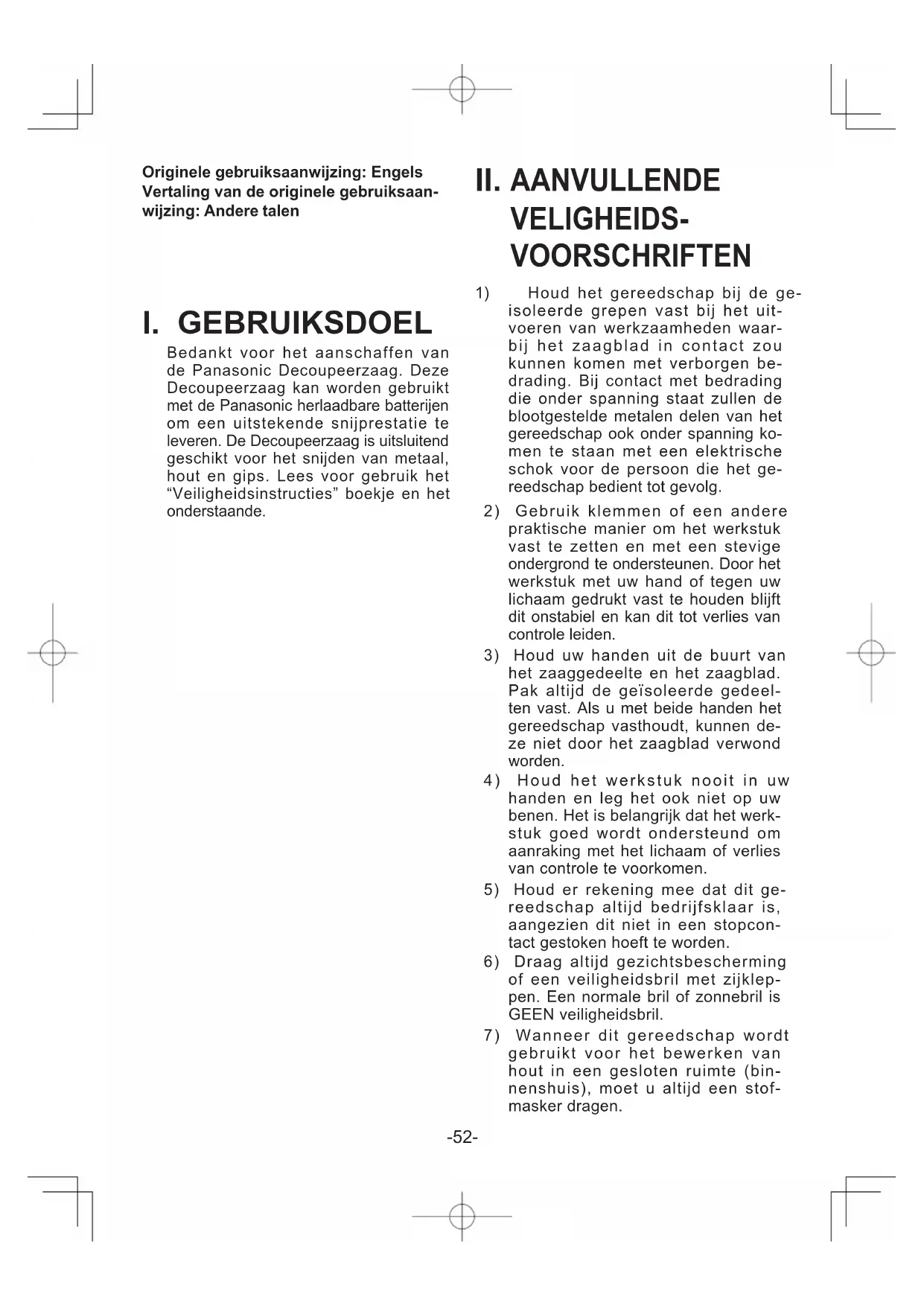 Bedankt voor het aanschaffen van de Panasonic Decoupeerzaag. Deze Decoupeerzaag kan worden gebruikt met de Panasonic herlaadbare batterijen om een uitstekende snijprestatie te leveren. De Decoupeerzaag is uitsluitend geschikt voor het snijden van metaal, hout en gips. Lees voor gebruik het “Veiligheidsinstructies” boekje en het onderstaande. II. AANVULLENDE VELIGHEIDS- VOORSCHRIFTEN