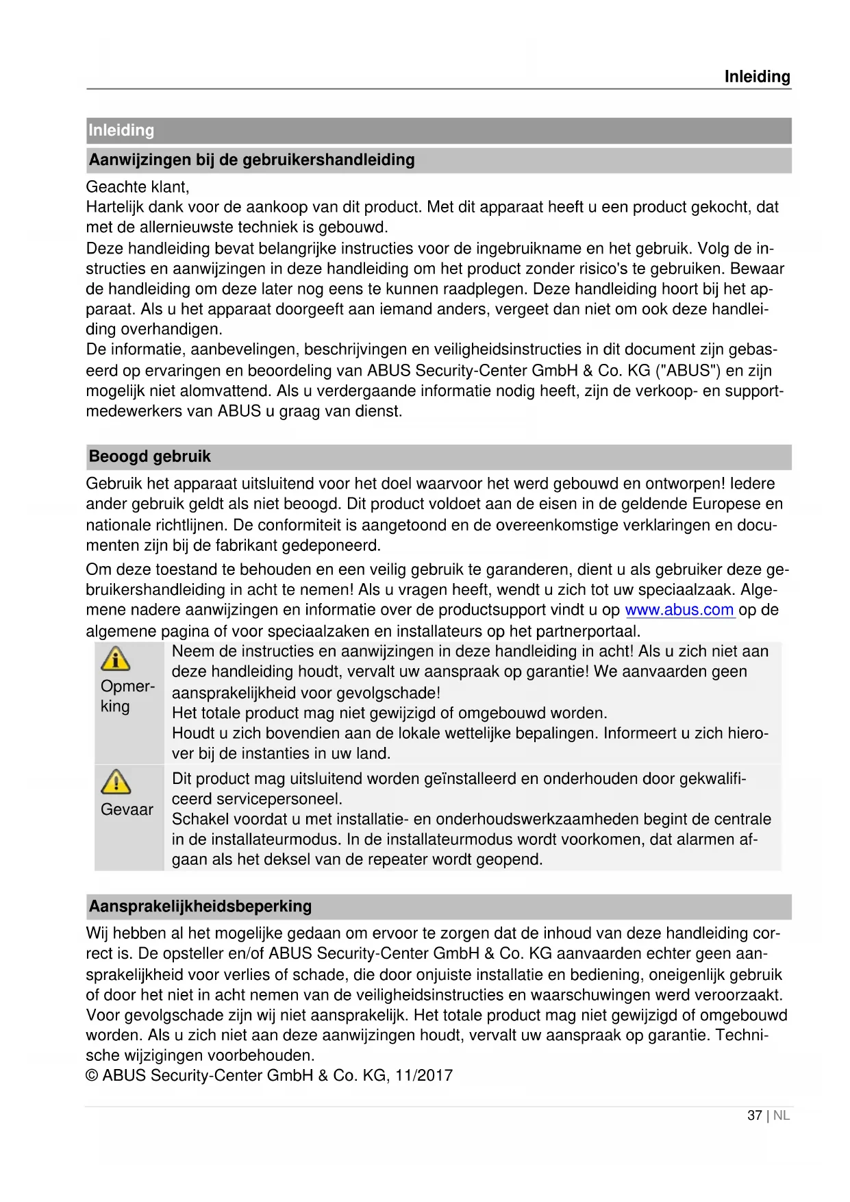 Aansprakelijkheidsbeperking Wij hebben al het mogelijke gedaan om ervoor te zorgen dat de inhoud van deze handleiding cor- rect is. De opsteller en/of ABUS Security-Center GmbH & Co. KG aanvaarden echter geen aan- sprakelijkheid voor verlies of schade, die door onjuiste installatie en bediening, oneigenlijk gebruik of door het niet in acht nemen van de veiligheidsinstructies en waarschuwingen werd veroorzaakt. Voor gevolgschade zijn wij niet aansprakelijk. Het totale product mag niet gewijzigd of omgebouwd worden. Als u zich niet aan deze aanwijzingen houdt, vervalt uw aanspraak op garantie. Techni- sche wijzigingen voorbehouden. © ABUS Security-Center GmbH & Co. KG, 11/2017Veiligheidsinstructies