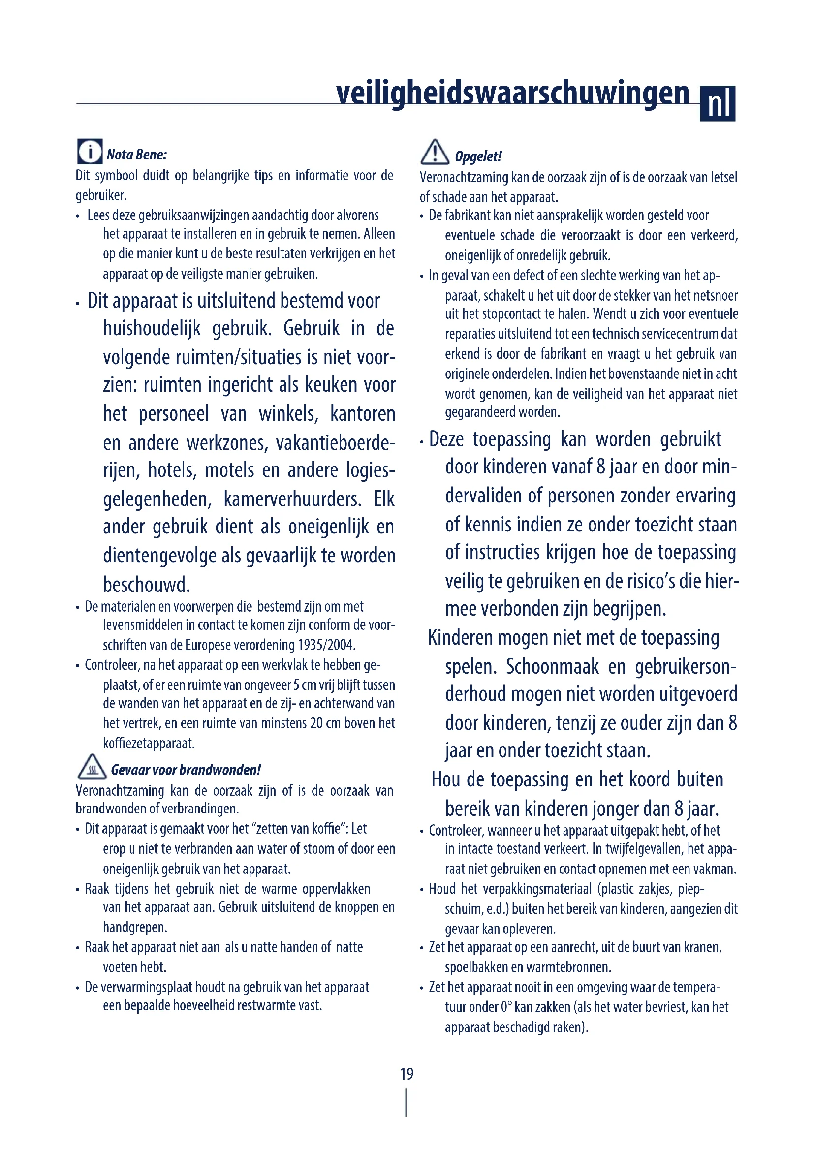 - Dit apparaat is uitsluitend bestemd voor huishoudelijk gebruik. Gebruik in de volgende ruimten/situaties is niet voor- zien: ruimten ingericht als keuken voor het personeel van winkels, kantoren en andere werkzones, vakantieboerde- rijen, hotels, motels en andere logies- gelegenheden, kamerverhuurders. Elk ander gebruik dient als oneigenlijk en dientengevolge als gevaarlijk te worden beschouwd.