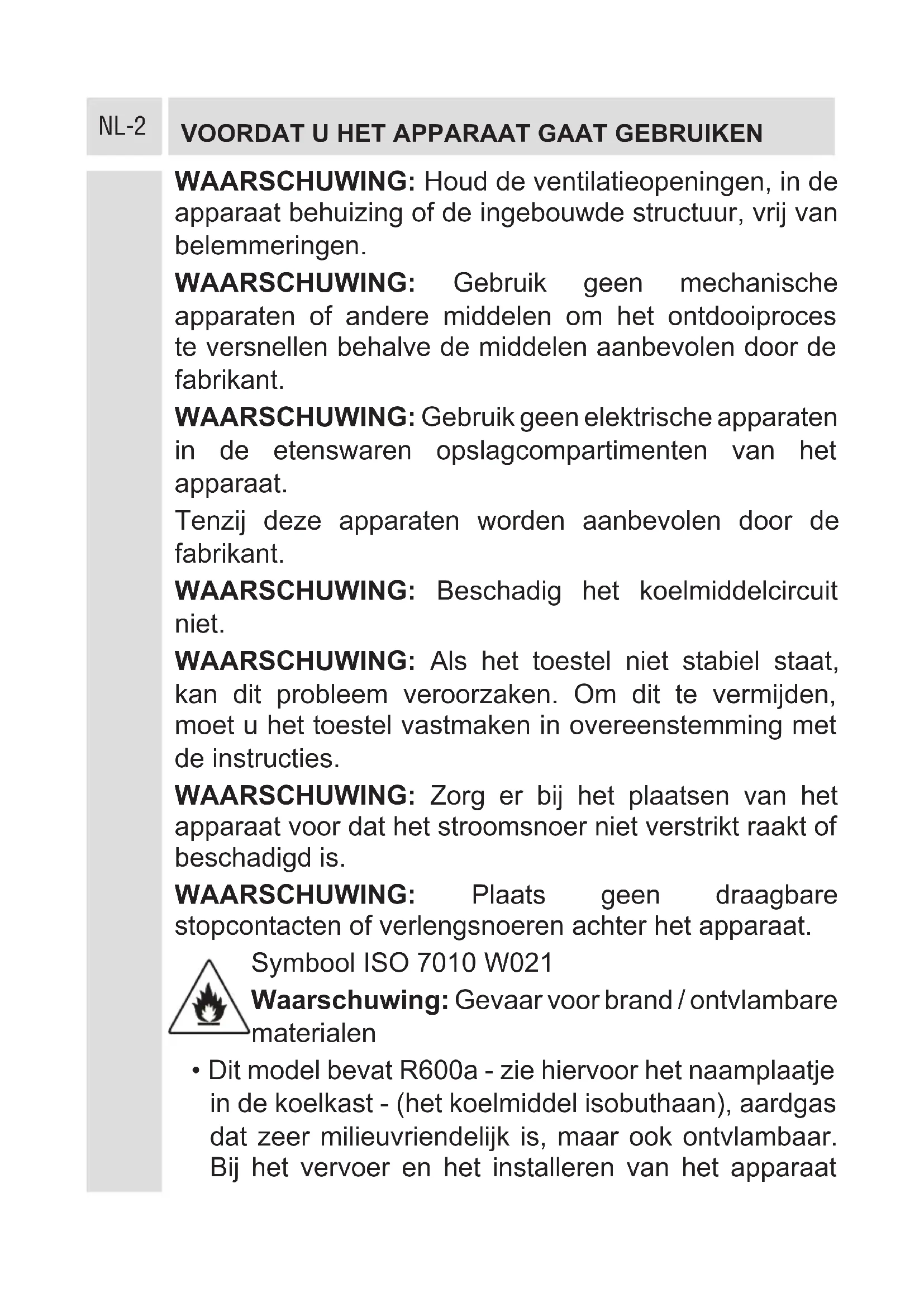 WAARSCHUWING: Houd de ventilatieopeningen, in de apparaat behuizing of de ingebouwde structuur, vrij van belemmeringen. WAARSCHUWING: Gebruik geen mechanische apparaten of andere middelen om het ontdooiproces te versnellen behalve de middelen aanbevolen door de fabrikant. WAARSCHUWING: Gebruik geen elektrische apparaten in de etenswaren opslagcompartimenten van het apparaat. Tenzij deze apparaten worden aanbevolen door de fabrikant. WAARSCHUWING: Beschadig het koelmiddelcircuit niet. WAARSCHUWING: Als het toestel niet stabiel staat, kan dit probleem veroorzaken. Om dit te vermijden, moet u het toestel vastmaken in overeenstemming met de instructies. WAARSCHUWING: Zorg er bij het plaatsen van het apparaat voor dat het stroomsnoer niet verstrikt raakt of beschadigd is. WAARSCHUWING: Plaats geen draagbare stopcontacten of verlengsnoeren achter het apparaat. Symbool ISO 7010 W021 Waarschuwing: Gevaar voor brand / ontvlambare materialen