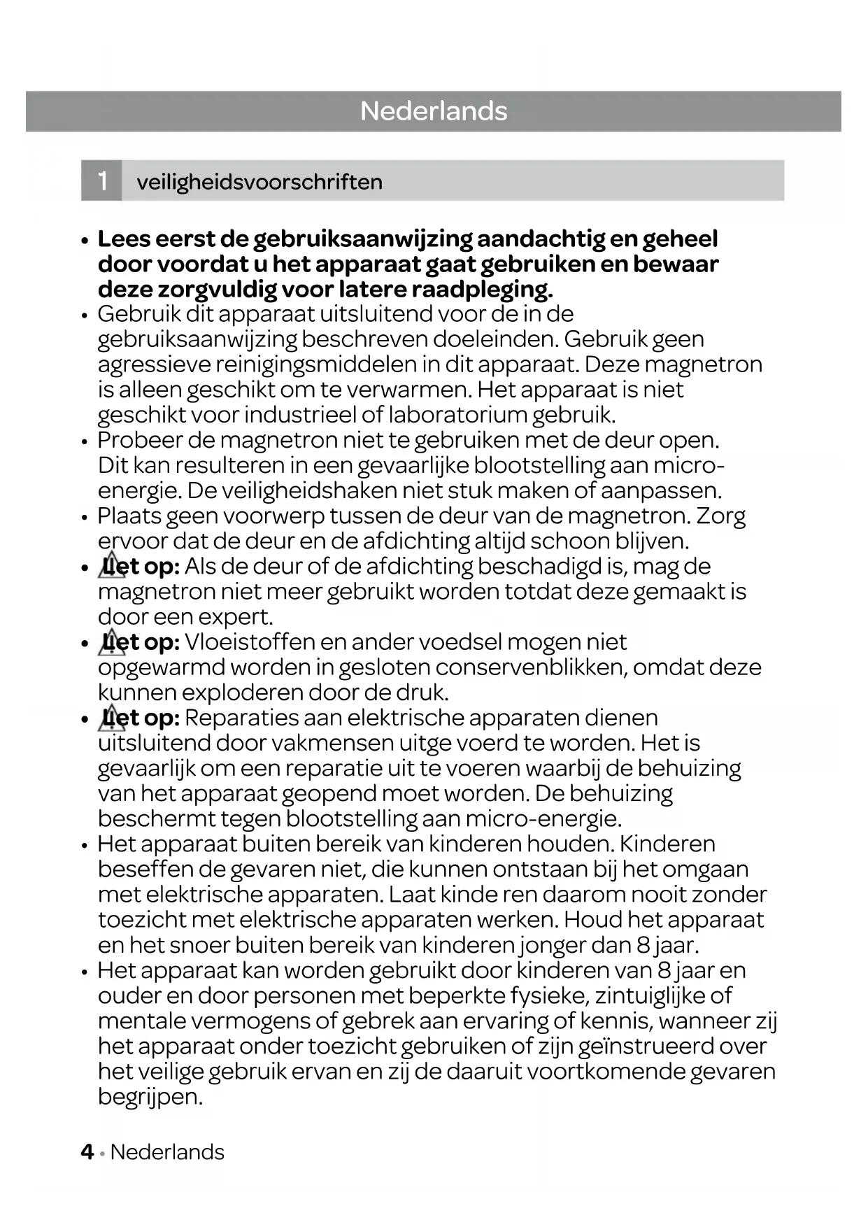 - Het apparaat kan worden gebruikt door kinderen van 8 jaar en ouder en door personen met beperkte fysieke, zintuiglijke of mentale vermogens of gebrek aan ervaring of kennis, wanneer zij het apparaat onder toezicht gebruiken of zijn geïnstrueerd over het veilige gebruik ervan en zij de daaruit voortkomende gevaren begrijpen. Nederlands veiligheidsvoorschriften