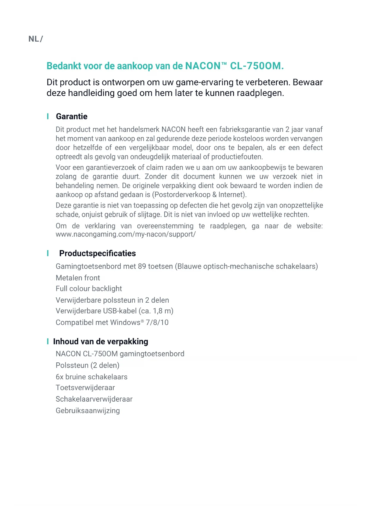7/8/10 ist ein eingetragenes Warenzeichen von Microsoft Corporation.NL / Bedankt voor de aankoop van de NACON™ CL-750OM. Dit product is ontworpen om uw game-ervaring te verbeteren. Bewaar deze handleiding goed om hem later te kunnen raadplegen. I Garantie Dit product met het handelsmerk NACON heeft een fabrieksgarantie van 2 jaar vanaf het moment van aankoop en zal gedurende deze periode kosteloos worden vervangen door hetzelfde of een vergelijkbaar model, door ons te bepalen, als er een defect optreedt als gevolg van ondeugdelijk materiaal of productiefouten. Voor een garantieverzoek of claim raden we u aan om uw aankoopbewijs te bewaren zolang de garantie duurt. Zonder dit document kunnen we uw verzoek niet in behandeling nemen. De originele verpakking dient ook bewaard te worden indien de aankoop op afstand gedaan is (Postorderverkoop & Internet). Deze garantie is niet van toepassing op defecten die het gevolg zijn van onopzettelijke schade, onjuist gebruik of slijtage. Dit is niet van invloed op uw wettelijke rechten. Om de verklaring van overeenstemming te raadplegen, ga naar de website: www.nacongaming.com/my-nacon/support/ I Productspecicaties Gamingtoetsenbord met 89 toetsen (Blauwe optisch-mechanische schakelaars) Metalen front Full colour backlight Verwijderbare polssteun in 2 delen Verwijderbare USB-kabel (ca. 1,8 m) Compatibel met Windows