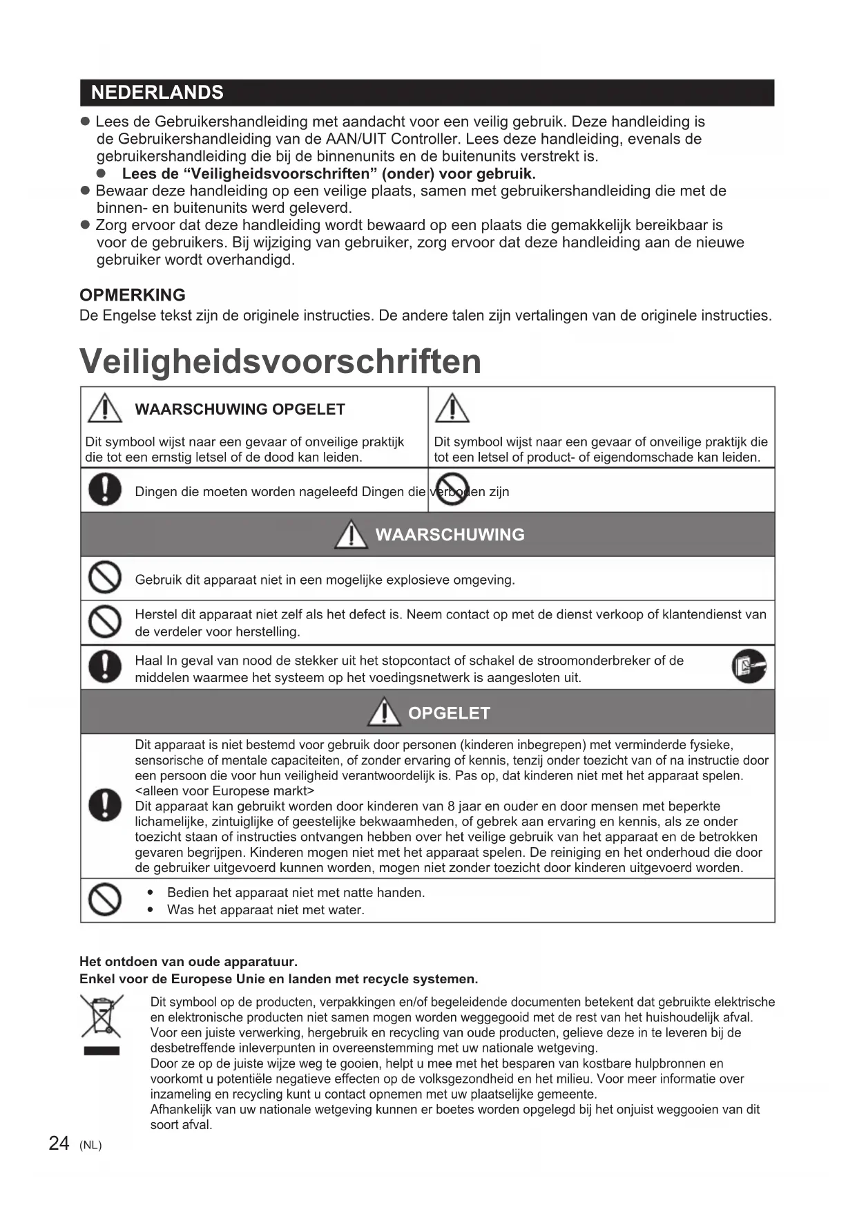 1 Per avviare o arrestare singoli gruppi di unità interne Premere il pulsante ON/OFF corrispondente al gruppo di unità interne. 2 Per avviare contemporaneamente le unità interne dei gruppi da 1 a 16 Premere il pulsante ALL ON. Le unità vengono avviate a intervalli di 1 – 2 secondi, a cominciare dal gruppo 1. 3 Per arrestare contemporaneamente le unità interne dei gruppi da 1 a 16 Premere il pulsante ALL OFF. z Su questa unità non è possibile impostare né la modalità operativa né le temperature. Tali impostazioni possono essere denite tramite il telecomando cablato, il controllore di sistema, ecc. Utilizzo della targhetta Le targhette consentono di individuare in quale stanza o area si trovano i condizionatori che è possibile controllare; sono inoltre presenti delle spie che indicano lo stato operativo dei condizionatori. Targhetta 1 Inserire un oggetto appuntito nel foro a sinistra della copertura trasparente per rimuoverla. 2 Scrivere il nome della stanza o dell’area a penna sull’etichetta a disposizione, quindi applicare l’etichetta sulla targhetta. CZ-ANC3_ACXF55-19832.indd 22 2021/09/28 10:43:4823 (IT) Informazioni importanti Se i pulsanti dell’unità lampeggiano, vericare quanto segue. 1 Se tutti i pulsanti da 1 a 16 stanno lampeggiando rapidamente (a intervalli da 0,2 secondi) L’unità non sta riconoscendo le unità interne. 2 Se i pulsanti lampeggiano rapidamente (a intervalli da 0,2 secondi) per 15 secondi dopo che questa unità è stata azionata Le unità interne dei gruppi lampeggianti non rispondono al funzionamento di questa unità. 3 Se ciascun pulsante sta lampeggiando lentamente (a intervalli da 1 secondo) Le unità interne dei gruppi lampeggianti sono in stato di allarme. z Se i problemi indicati sopra persistono, contattare il rivenditore. Speciche Modello N. CZ-ANC3 Dimensioni (H) 120,5 mm × (L) 121,5 mm × (l) 14 + 51,1 mm Peso 500 g Intervallo temperatura/ umidità Da 0 °C a 40 °C / da 20% a 80% (Niente condensa) *Solo uso interno. Fonte di Alimentazione Fase singola da 100 a 240 V ~ 50 – 60 Hz Consumo energia Massimo 4,0 W Numero di unità interne connesse Fino a 16 gruppi (64 unità) ITALIANO CZ-ANC3_ACXF55-19832.indd 23 2021/09/28 10:43:4924 (NL) NEDERLANDS z Lees de Gebruikershandleiding met aandacht voor een veilig gebruik. Deze handleiding is de Gebruikershandleiding van de AAN/UIT Controller. Lees deze handleiding, evenals de gebruikershandleiding die bij de binnenunits en de buitenunits verstrekt is. z Lees de “Veiligheidsvoorschriften” (onder) voor gebruik. z Bewaar deze handleiding op een veilige plaats, samen met gebruikershandleiding die met de binnen- en buitenunits werd geleverd. z Zorg ervoor dat deze handleiding wordt bewaard op een plaats die gemakkelijk bereikbaar is voor de gebruikers. Bij wijziging van gebruiker, zorg ervoor dat deze handleiding aan de nieuwe gebruiker wordt overhandigd. OPMERKING De Engelse tekst zijn de originele instructies. De andere talen zijn vertalingen van de originele instructies. Veiligheidsvoorschriften WAARSCHUWING OPGELET Dit symbool wijst naar een gevaar of onveilige praktijk die tot een ernstig letsel of de dood kan leiden. Dit symbool wijst naar een gevaar of onveilige praktijk die tot een letsel of product- of eigendomschade kan leiden. Dingen die moeten worden nageleefd Dingen die verboden zijn WAARSCHUWING Gebruik dit apparaat niet in een mogelijke explosieve omgeving. Herstel dit apparaat niet zelf als het defect is. Neem contact op met de dienst verkoop of klantendienst van de verdeler voor herstelling. Haal In geval van nood de stekker uit het stopcontact of schakel de stroomonderbreker of de middelen waarmee het systeem op het voedingsnetwerk is aangesloten uit. OPGELET Dit apparaat is niet bestemd voor gebruik door personen (kinderen inbegrepen) met verminderde fysieke, sensorische of mentale capaciteiten, of zonder ervaring of kennis, tenzij onder toezicht van of na instructie door een persoon die voor hun veiligheid verantwoordelijk is. Pas op, dat kinderen niet met het apparaat spelen. <alleen voor Europese markt> Dit apparaat kan gebruikt worden door kinderen van 8 jaar en ouder en door mensen met beperkte lichamelijke, zintuiglijke of geestelijke bekwaamheden, of gebrek aan ervaring en kennis, als ze onder toezicht staan of instructies ontvangen hebben over het veilige gebruik van het apparaat en de betrokken gevaren begrijpen. Kinderen mogen niet met het apparaat spelen. De reiniging en het onderhoud die door de gebruiker uitgevoerd kunnen worden, mogen niet zonder toezicht door kinderen uitgevoerd worden. y Bedien het apparaat niet met natte handen. y Was het apparaat niet met water. Het ontdoen van oude apparatuur. Enkel voor de Europese Unie en landen met recycle systemen. Dit symbool op de producten, verpakkingen en/of begeleidende documenten betekent dat gebruikte elektrische en elektronische producten niet samen mogen worden weggegooid met de rest van het huishoudelijk afval. Voor een juiste verwerking, hergebruik en recycling van oude producten, gelieve deze in te leveren bij de desbetreffende inleverpunten in overeenstemming met uw nationale wetgeving. Door ze op de juiste wijze weg te gooien, helpt u mee met het besparen van kostbare hulpbronnen en voorkomt u potentiële negatieve effecten op de volksgezondheid en het milieu. Voor meer informatie over inzameling en recycling kunt u contact opnemen met uw plaatselijke gemeente. Afhankelijk van uw nationale wetgeving kunnen er boetes worden opgelegd bij het onjuist weggooien van dit soort afval. CZ-ANC3_ACXF55-19832.indd 24 2021/09/28 10:43:4925 (NL) Voorzorgsmaatregelen voor de werking z Stel het apparaat niet op in de volgende soorten locaties. y Bij aanwezigheid van vocht, olie of trillingen/In rechtstreeks zonlicht/Vlakbij warmtebronnen/Waar condens gevormd wordt. (Deze plaatsen kunnen defecten tot gevolg hebben.) y Waar ruis optreedt. (Dit kan een onjuiste werking tot gevolg hebben.) z Reinig het niet met ben