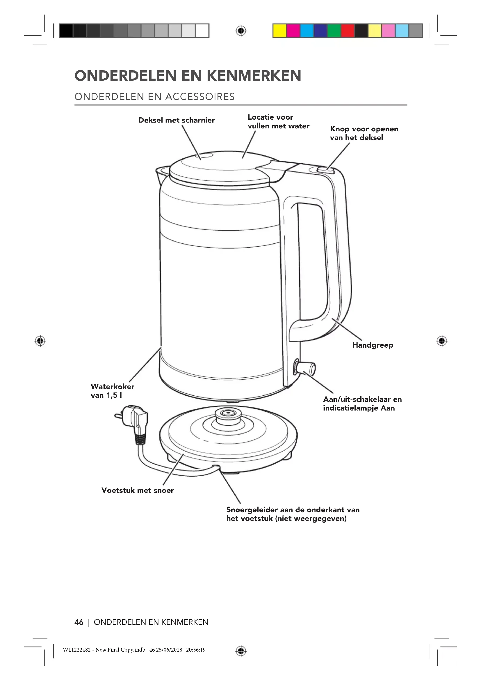 Locatie voor vullen met water Knop voor openen van het deksel Deksel met scharnier Voetstuk met snoer Aan/uit-schakelaar en indicatielampje Aan Handgreep Waterkoker van 1,5 l Snoergeleider aan de onderkant van het voetstuk (niet weergegeven) W11222482 - New Final Copy.indb 46 25/06/2018 20:56:19NEDERLANDS